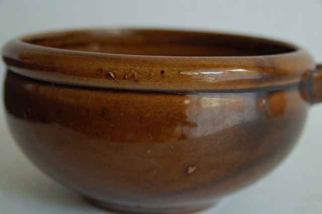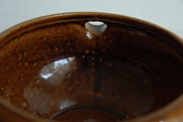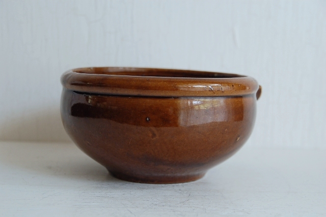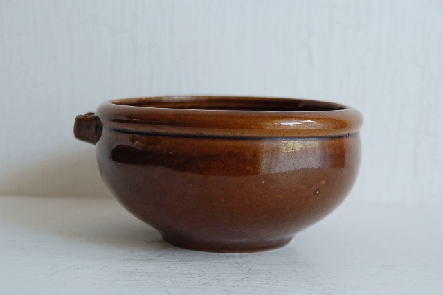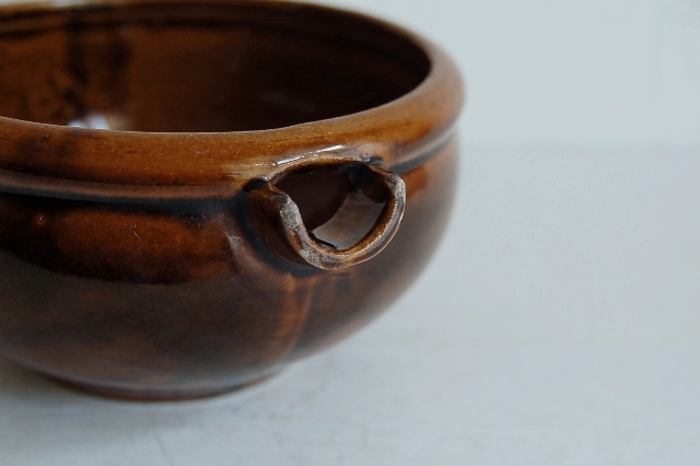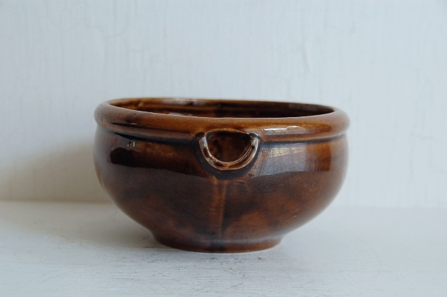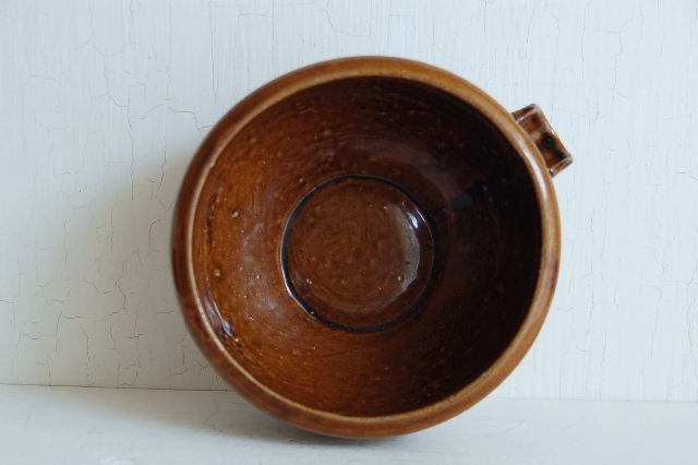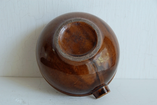すっきりと仕上がった飴釉薬の片口。焼き上がりもまずまず。美濃焼だと思います。半々に釉薬を掛けているのでちょうど口の下に線が入ったような跡が出来て仕事ぶりが垣間見れます。嫌味のない飴釉、丸みのある柔らかな形でで普段使いに最適。日常で使われていたものですので口にホツ、縁周りにホツがちょこちょことございますがニュウなどはございません。良い状態といって良いものだと思います。程好く使い込まれた味もどこか落ち着きのある表情です。