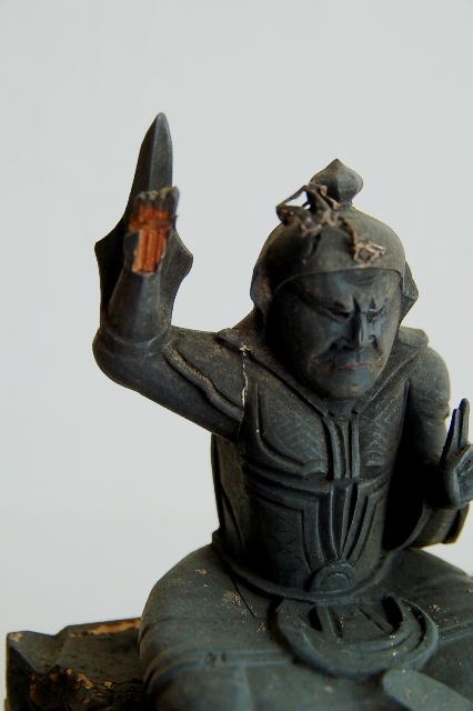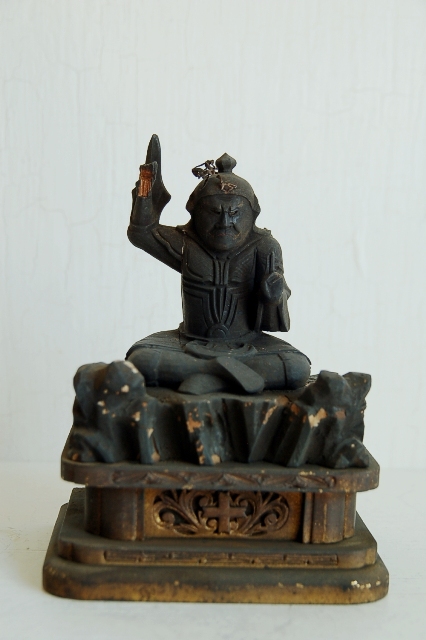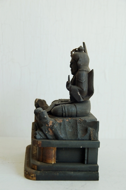 木彫の妙見菩薩坐像。玉眼です。一見厳しい表情と思いますが柔らかな感覚を感じます。妙見菩薩は仏教における信仰対象の天部のひとつ。妙見とは優れた視力の意で善悪や真理を良く見通せることのこと。道教、密教、陰陽道などの要素が混合し容姿は一定していないのですが、この坐像の造形は多く見られます。あげている右手に欠損、持物、装飾品は欠品しています。飾りやすいサイズも良く、彫も良いです。