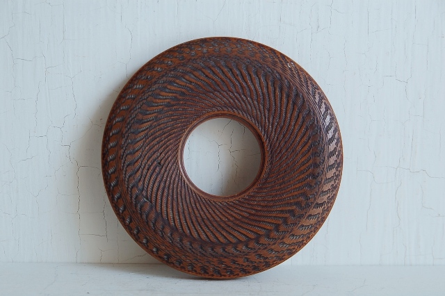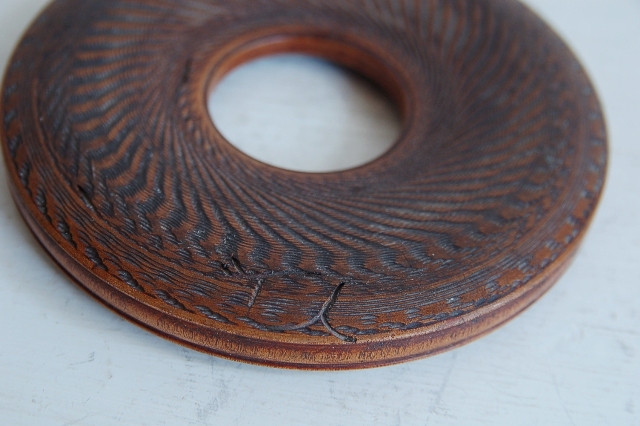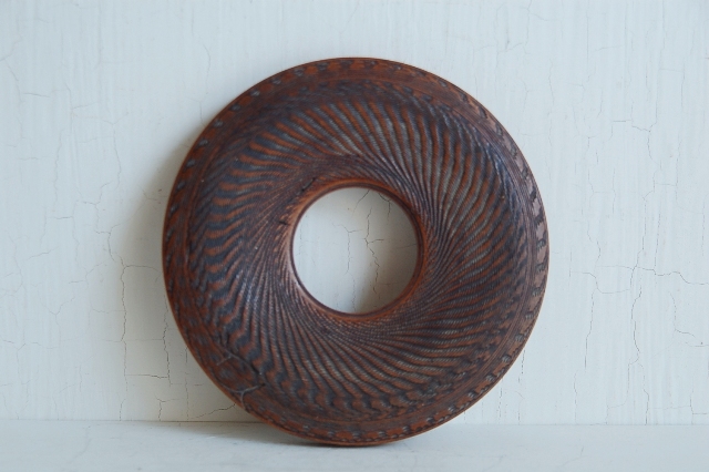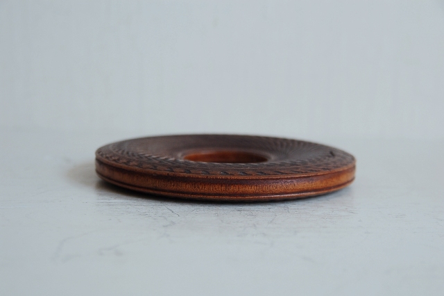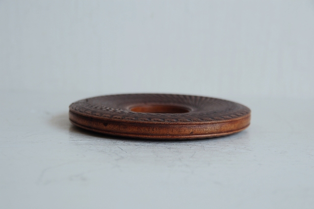 木製の瓶床。煎茶道具で急須をのせる台で急須台とも呼ばれています。竹や金属製など種類も様々なものがありますが、硬木の欅製です。長年使われてきた味に轆轤でつけられた細かなノミ跡も魅力があります。急須をのせるのはもちろん、コーヒーのポットを置いたりするのにも便利。しっかりとしたものですので長年飽きずに扱いいただけます。