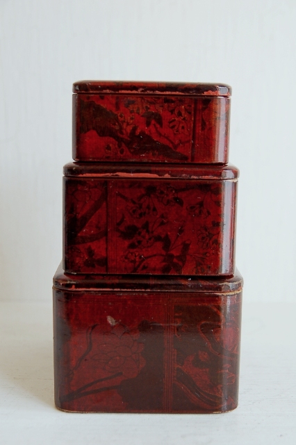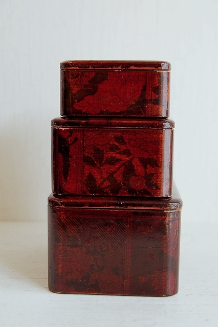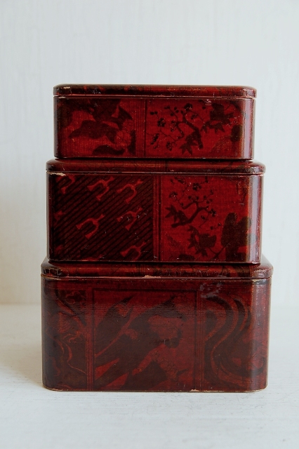 大中小と三つの箱。大きな箱にすべて収納できます。弁当箱だと思います。木地に雅な柄の紙をきせその上から漆で仕上げている珍しい仕上げです。柄は目立ちすぎずやんわりと目に入ってくる上品さがいかにも京都のものらしいもの。外には使用感がそれなりにありますが、内部は朱塗部分も状態はよく、弁当箱としてもお使いいただけると判断しております。もちろん小物などを整理したり大事なものを収納するにも良さそうです。目立ちすぎない柄が好感が持てる品。シンプルなものが人気の昨今ですがこんな感じものであれば時代に左右されず飽きずに使えそうです。