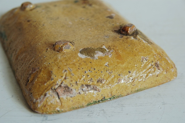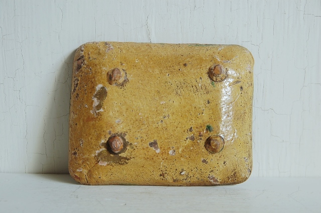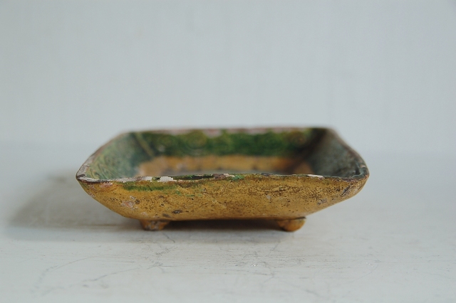 源内焼の角皿。軟質のものでその柔らか質感から漂う儚さを感じる品。デルフトやスペインの古陶のような表情は平賀源内(あのエレキテル人)がそれらの製法をもとに開窯しただけに独特です。一応、評価の高い三彩ですが素朴で抜けも繊細さに欠け、釉薬に剥がれもあり評価されているものとは正反対のものかもしれませんが何とも言えない魅力を放っています。実は京焼かとも迷う点も多いですが、源内焼と判断しましたで詳しい方おりましたら御教授下さい。小ぶりながら存在感がある一品。古陶磁器にご理解の上御注文下さい。