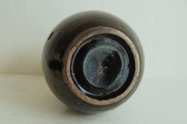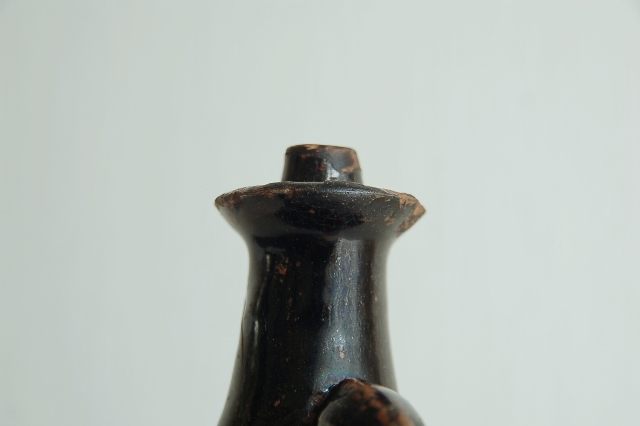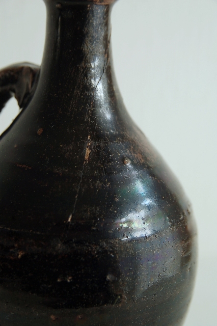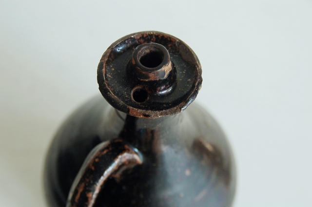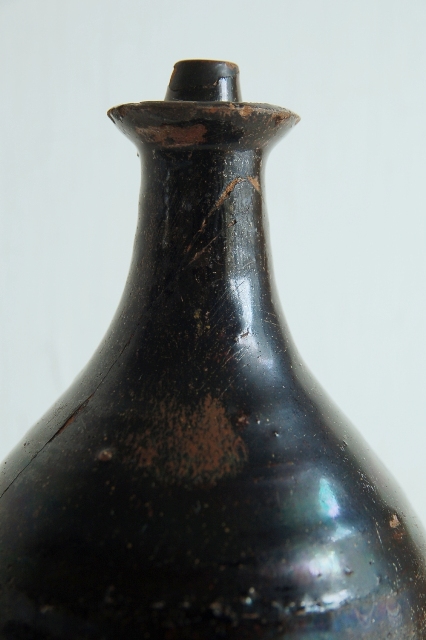 黒釉の油徳利。使い込まれた表情と渋い釉薬が印象的です。九州地方の窯のものだと思います。注ぎ口は当時高価だった油を少しでも無駄にしない工夫が施されています。上部に受けがあり、少しのこぼれもないように再び小さな穴から元に戻るつくりになっています。造形的にも良く、無国籍な雰囲気があります。胴廻りにV字型の大きなニュウ、口と高台に共直し、小ホツ、釉薬の表面に使い込まれた細かな傷などございますが日々日常でつかわれていたリアルな表情ですのでそれらもこの徳利の持つ魅力。