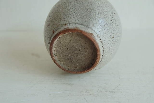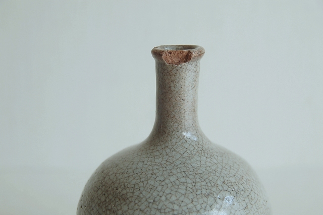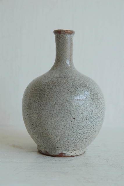 小振りなサイズの徳利。酒器にちょうど良いサイズですが少々油臭が残っております。油徳利として使われていたものでしょう。時代は唐津愛好家や酒器愛好家にとっては若いと言われそうですが、まずまずの丁寧なつくりに程好い古格と何といってもあっさりとした印象、サイズが良いです。残念な事に口にソゲがあるのが残念です。花器としては問題ございませんが酒器としては綺麗なのですが若干油臭がかすかに残っているように感じます。