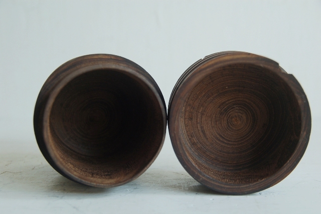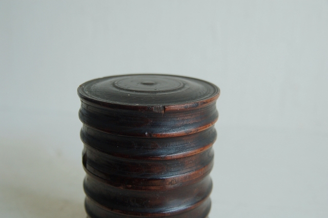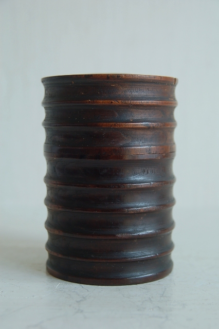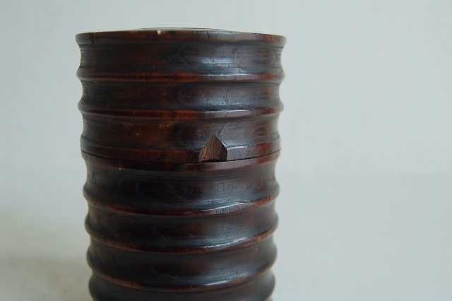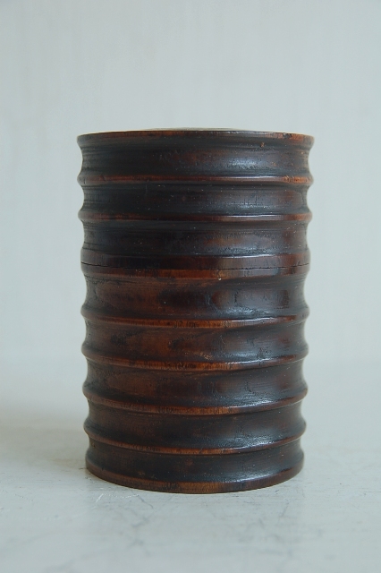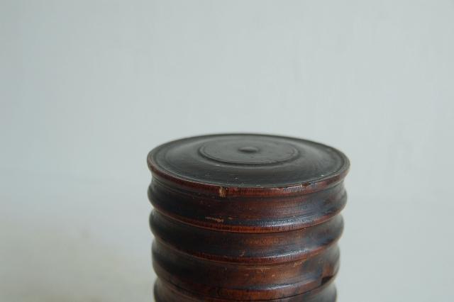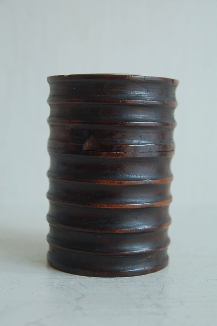 味わいのある使い込まれた茶筒。煎茶などで使われていた御道具ではなく日々日常で使われていたもの。材は硬木、内部の素地をみると濃い色目で目が詰まっている硬い材料です。外側表面は仕上げが施しております。拭き漆か油を塗ったものでかなりの年数を使わなければこのような表情にはならないでしょう。古いカケが数箇所ありますが、その部分自体経年により色合いも変化しているので気にはなりません。大きさも良く、茶葉はもちろんコーヒー豆なども収納するのに良いかと思います。