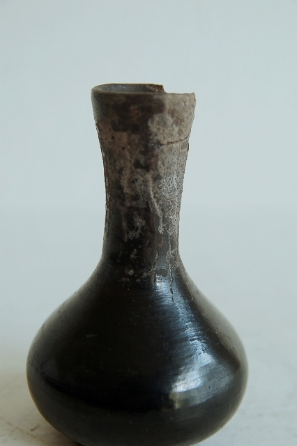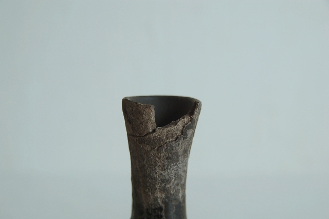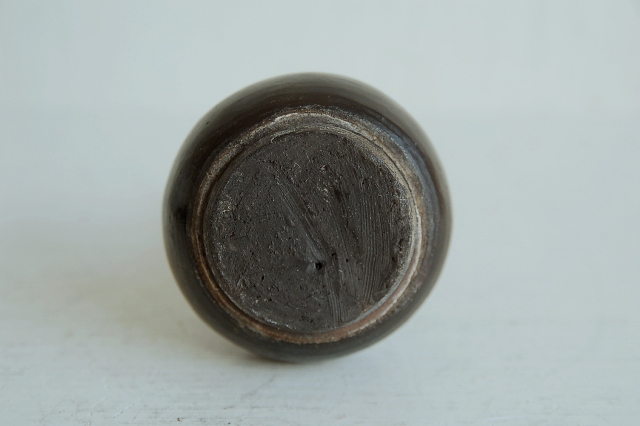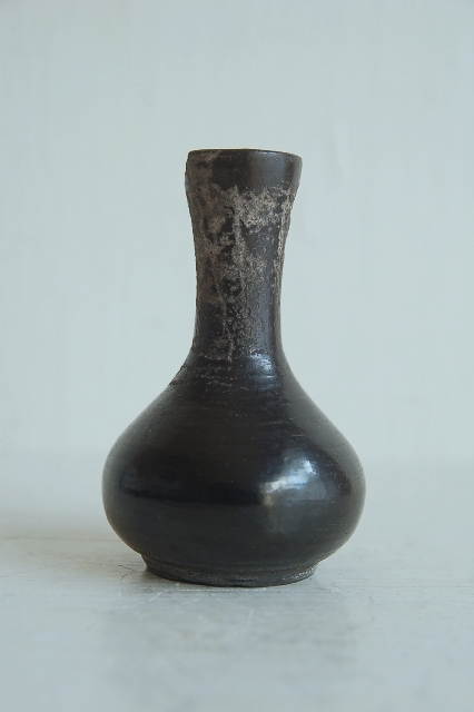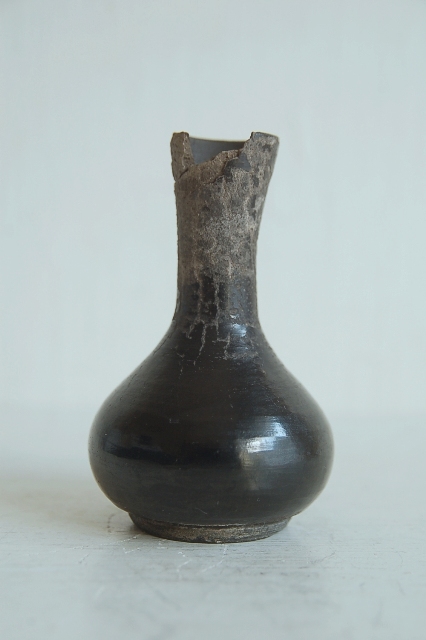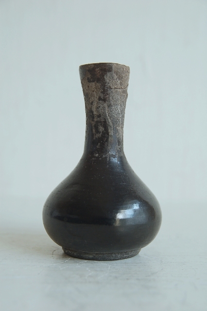 黒い表面は釉薬ではなく漆仕上げですので「瓦胎漆器」と思われます。柔らかさはありますが陶器に近い感じも伺えます。大陸のものなのか日本のものなのか断定はできません。首の痛み具合から推測するに発掘されたものかも知れませんが、漆の部分は非常にきれいです。木製ではないので素材の収縮が少なくこのような状態が保っているのでしょう。あくまでも推測の域は出ないですが、銅器などが高価だった為、木よりも形が自由自在に成型できる瓦胎(陶胎?)で造ったのではないでしょうか。造形からして銅器の写しではないかと思っています(浅学のためすべて推論ですがお詳しい方がおりました是非御教授下さい)。時代は結構古いと思います。花器にはもちろん、振出にしても面白かと思います。そのまま飾っても小品ながらも存在感があります。首に漆の剥げ、素地の風化している箇所、欠けた部分を直した跡がございますので御確認の上御注文下さい。