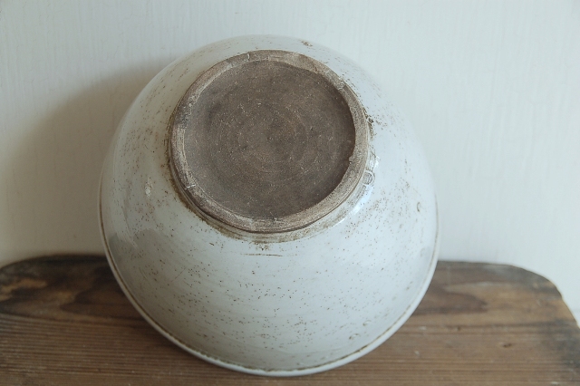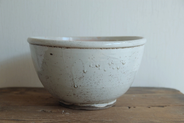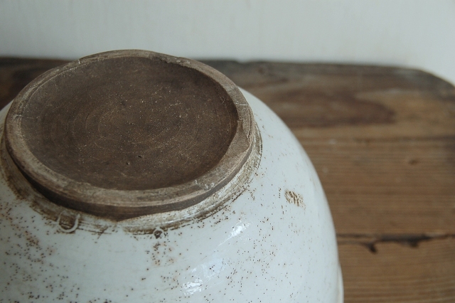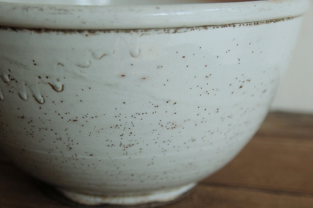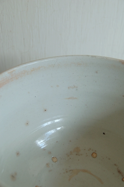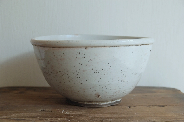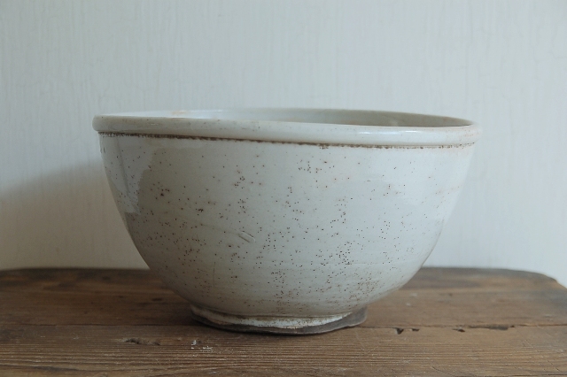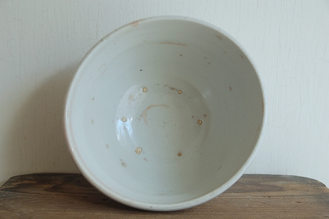 本郷焼の白磁大鉢。飴釉の印象が強い本郷焼ですが数は少ないですが白磁も生産していおりました。見た感じ李朝中期の白磁を思い起こさせるような肌が印象的。数が少ないので地元ですら山形の平清水と間違われてしまうこともしばしば。場所が近いですので形は似ていますが平清水は粉引きでもっと肉厚。東北で白磁と言えば切込ですが、もっと黄色っぽくこの手の実用品だと焼が甘めで磁貫が入っています。本郷白磁はもともと数も少なく、高い評価をされているものではないので見つけるのは非常に困難、今となっては希少なものとなってしまったようです。