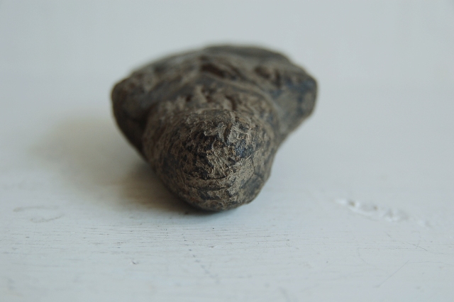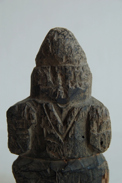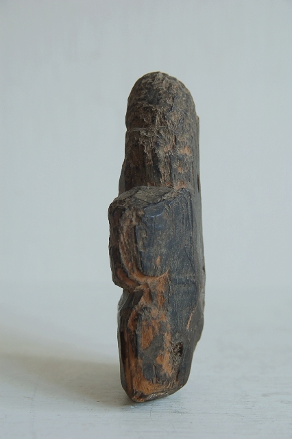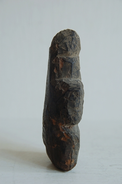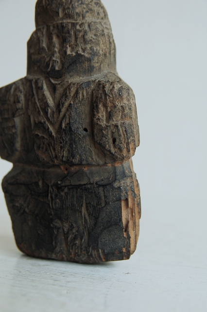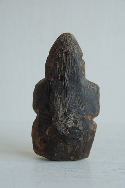 会津地方の山間部で山の民に信仰された木彫の神像。材は松、煤けた表情と素朴な造形は温かみを感じます。経年により木目が浮き出て来た部分、角が丸くなった部分、虫食いなどもございますがそれも魅力ある表情の一部。近代化と共に日本にも西洋的思想が浸透し、日本の信仰でさえも一神教が近代的あるとした流れに傾いていきましたが、身近な自然にリスペクトする感情はごく自然なこと。そんなことを思い出させてくれるようなプリミティブな造形の品です。