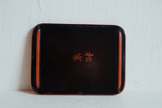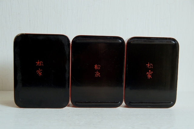 三段の可愛らしい朱塗の弁当箱。内は黒漆で上の段に仕切りもあり大きさも程良いです。角もRになっているので女性的な柔らかな印象です。「松家」と屋号がありますので、仕出などで使われていたのでしょうか。外側に擦れや角に剥離がありますが弁当箱として使えない状態ではございません。小物入れとしても良さそうです。画像の布は撮影用です。