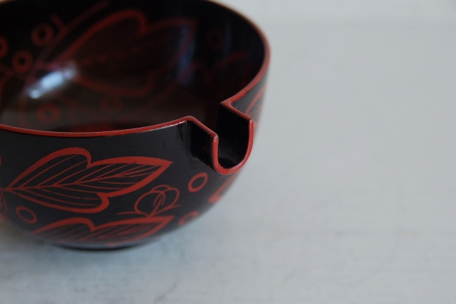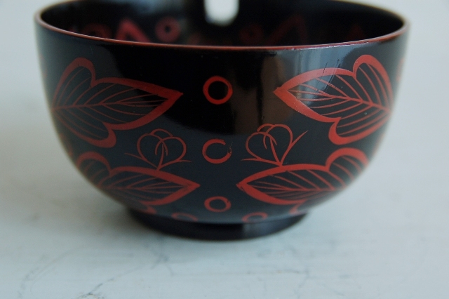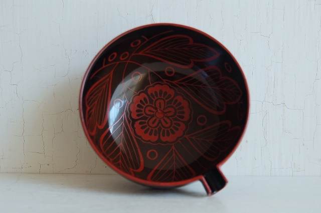 奈良県吉野地方の吉野塗。吉野塗定番の文様ですが片口はあまり見かけません。大きさもベストです。丸く柔らかな形ながらもすっきりとした印象を受けます。時代のトレンドはシンプルで無地のものが多いですが、インパクトがある文様ですがこの簡素な絵付けは良いです。お好きな盃や陶磁器と一緒に是非お使い下さい。内側に焼け、見込中央に漆の浮きに亀裂があります。まだ使えると思いますが画像にてご確認下さい。