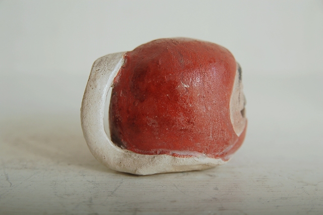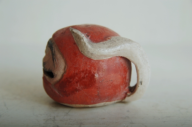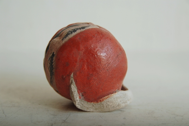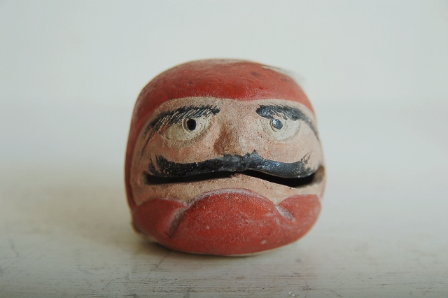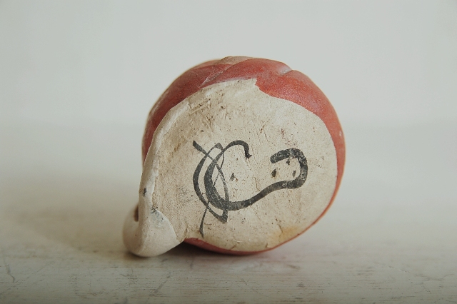 良い面構えをした達磨の土鈴。土鈴と書きましたが、郷土玩具の土人形や土鈴と違い彩色後、窯でしっかりと焼いている感じです。造形もすっきりとしております。茶席で呼鈴として生まれたものかなあとも思っております。底には瓢を模したような銘が筆で入っております(京焼の茶碗で同じような銘を見たような気がします)。呼び鈴としても良いですし、そのまま飾っても良いでしょう。宮崎駿作品に登場しそうな愛嬌ある達磨です。