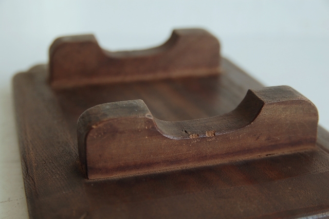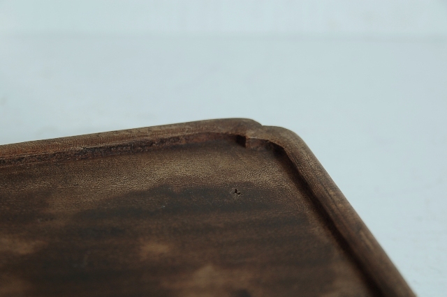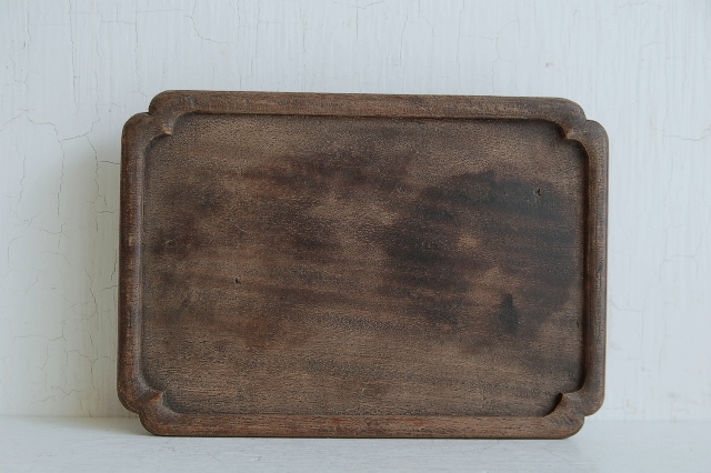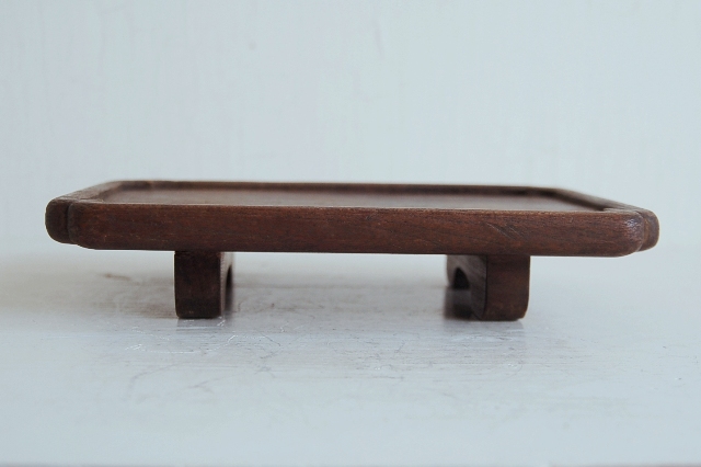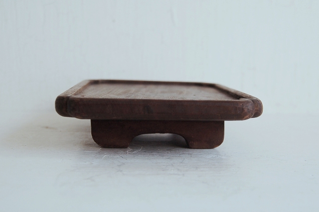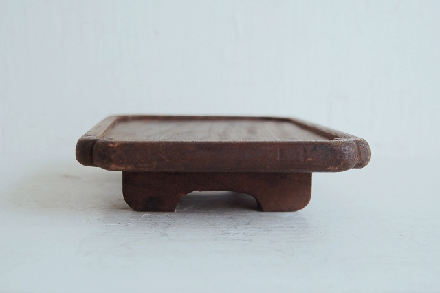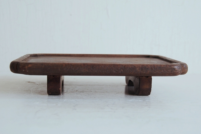 素朴な風合いの手力盆。地元、奈良らしい一品。晩酌用の盆としては小さいですが、お気に入りのものを飾る台に最適。香炉や小さな仏像はもちろんどんなものにも合いそうな懐の深さを感じます。材は色合いからして栗材かなと思います。落ち着いた色合いで小さいながらもどっしりとした安定感があります。擦れ、脚の角に少々のカケはありますがいずれも古いもので気にならない程度です。