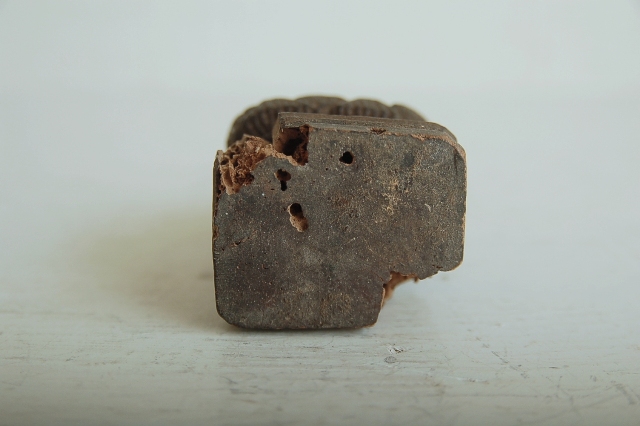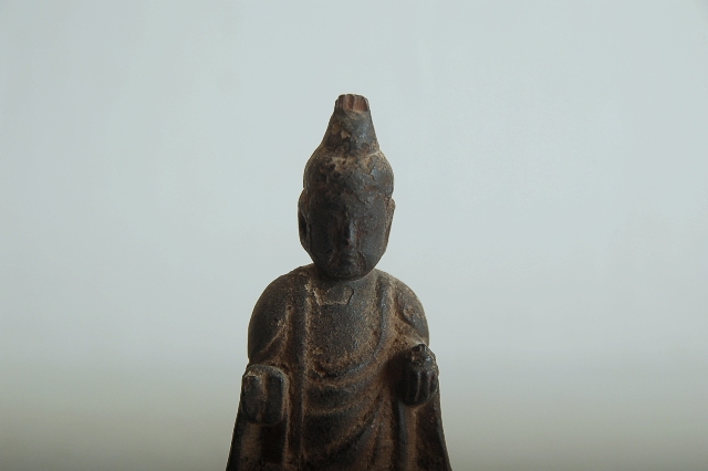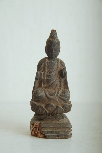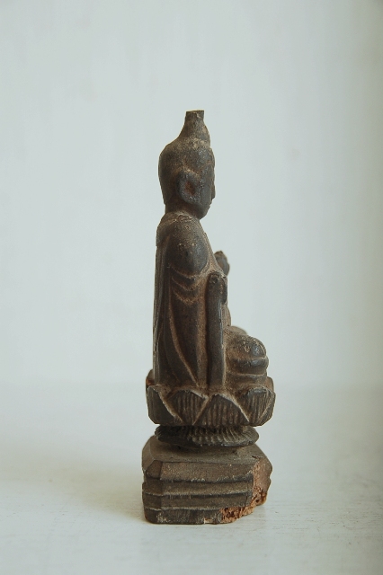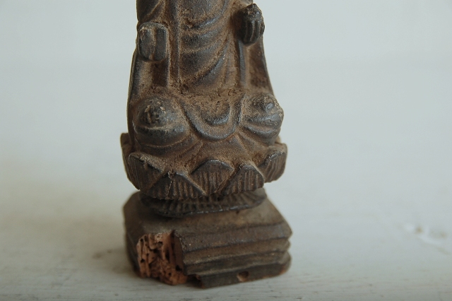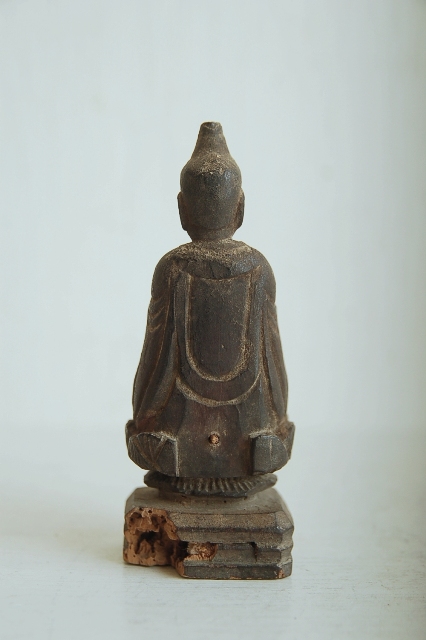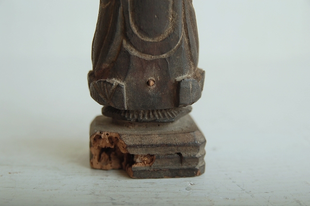 後下部に虫食いがあります。脆くなっていますが気をつければ大丈夫です。台座付近が痛みが多く、仏像本体には及んではおりません。サイズも小ぶりで飾る場所を選びません。