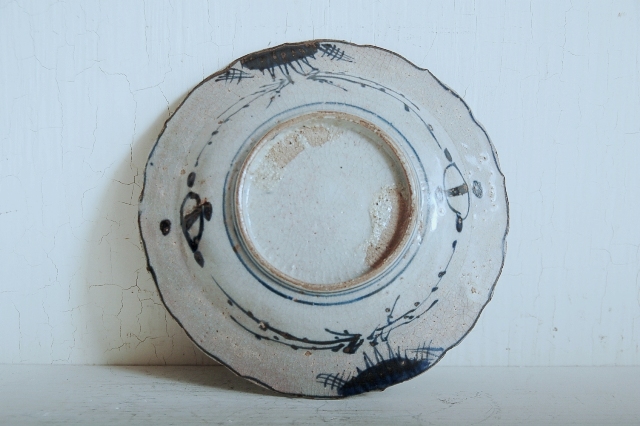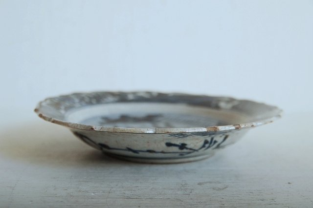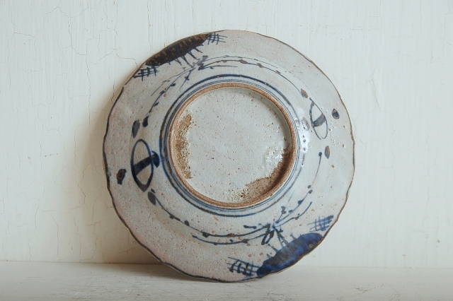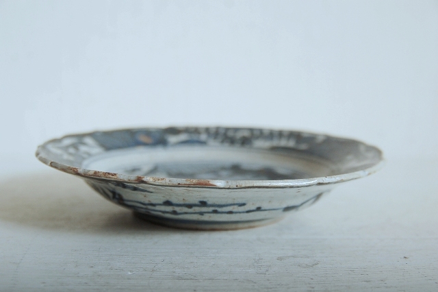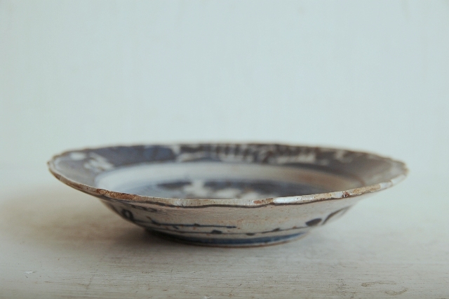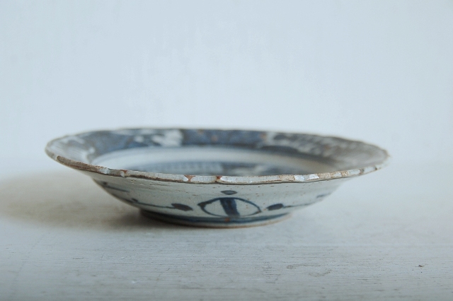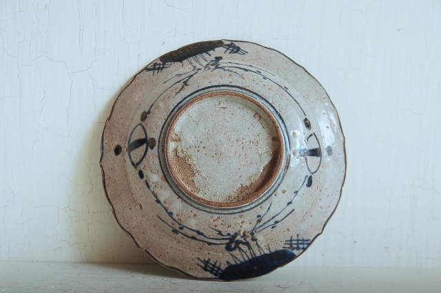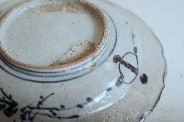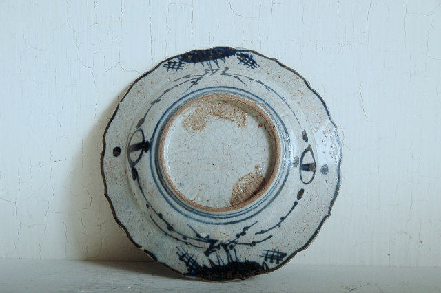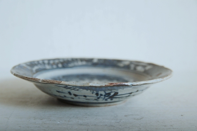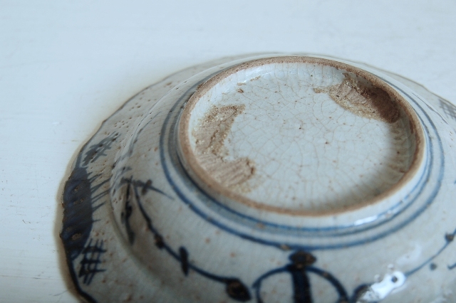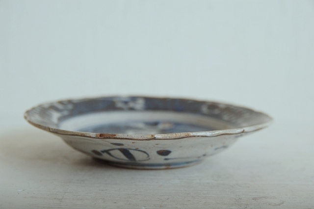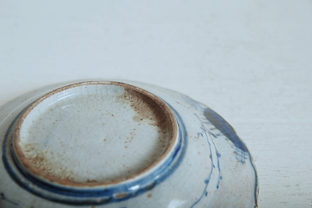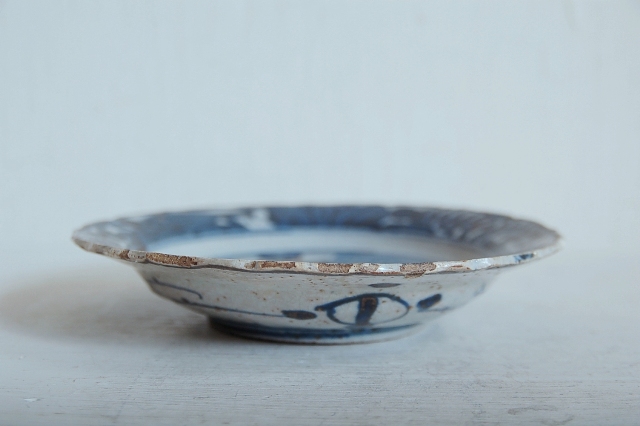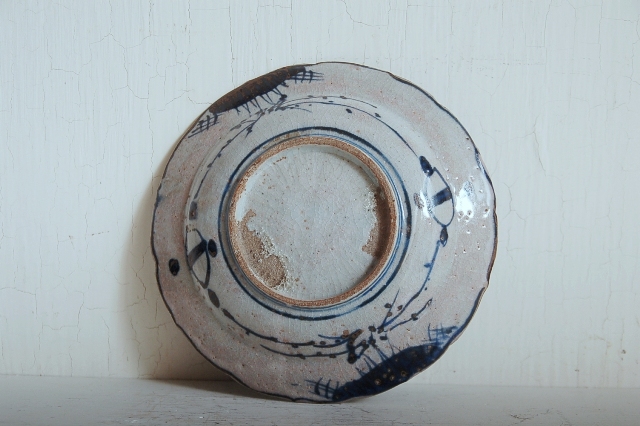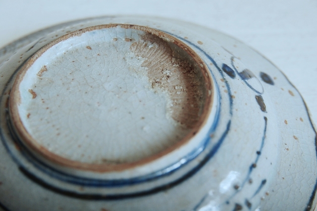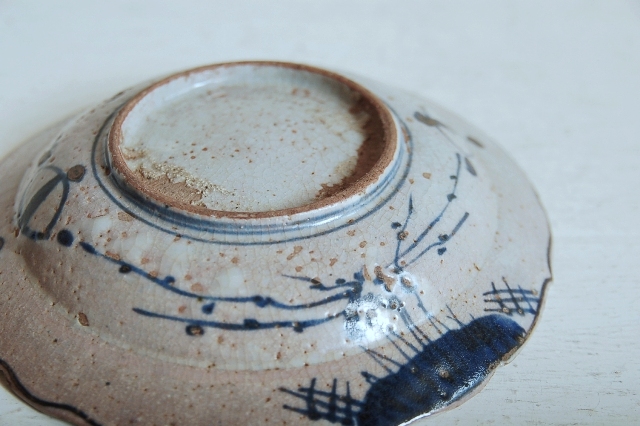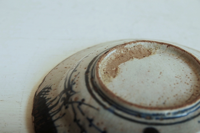 上がりは若干甘め、縁周りに釉薬のハゲが所々ありますが、これは「虫食い」と呼ばれているものでダメージではございません。本歌古染付の明末〜清初にかけて荒く作られたものを茶人が好んだことからそう呼ばれおり、この皿もその「虫食い」を再現したものです。王子山焼自体数は多くなく希少です。