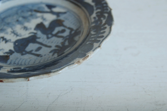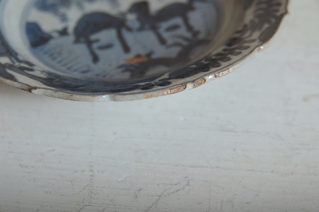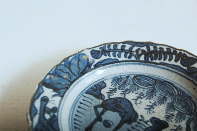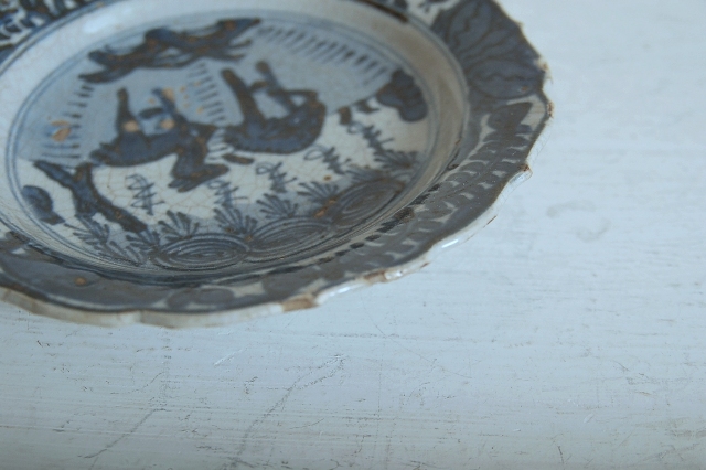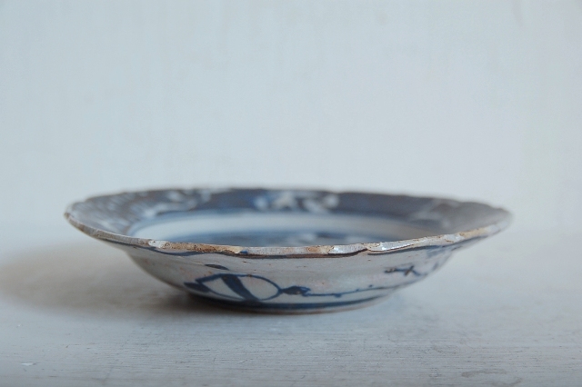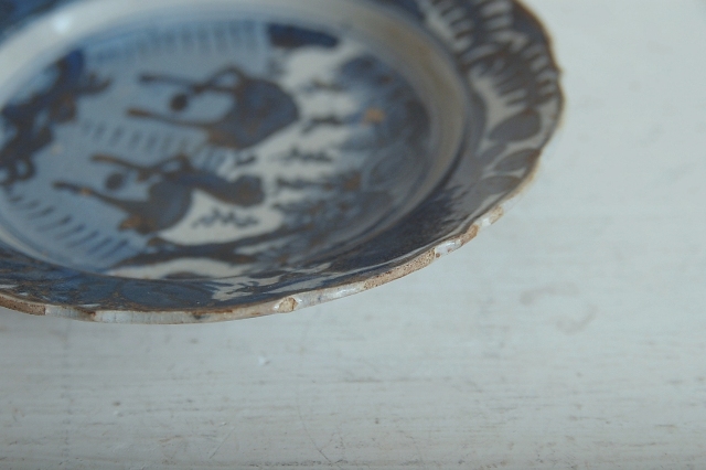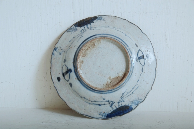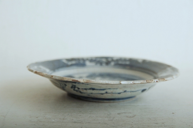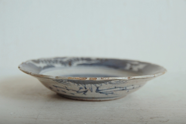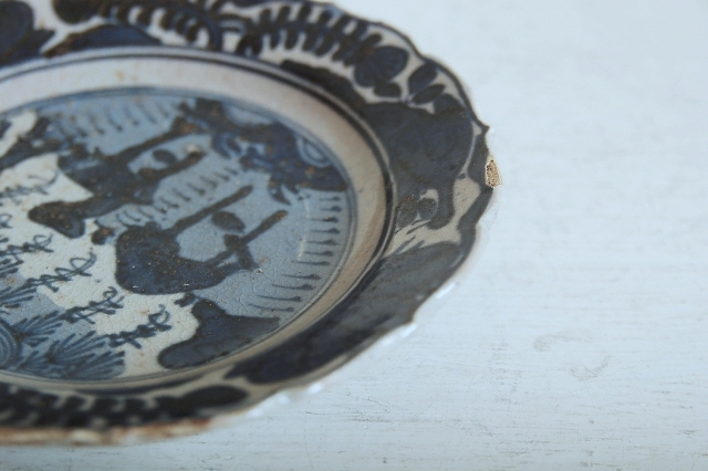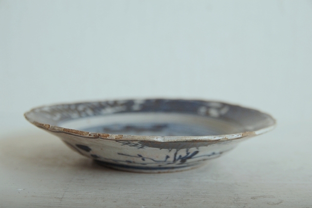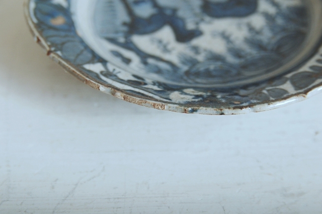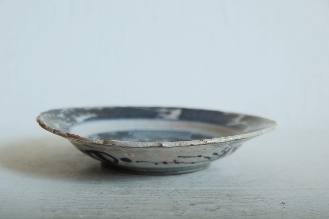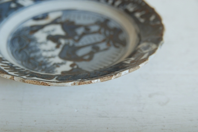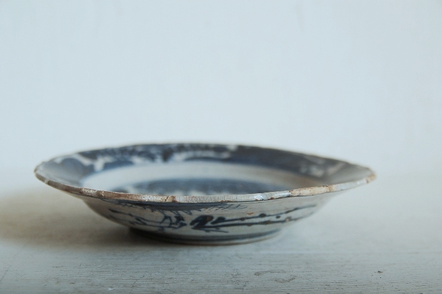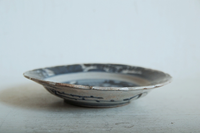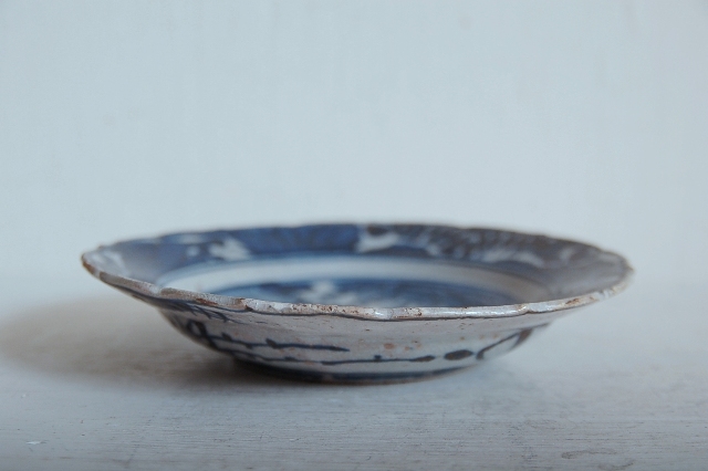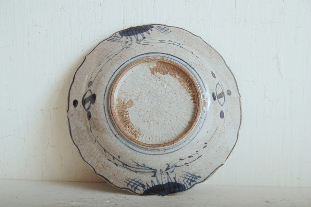 上がりは若干甘め、縁周りに釉薬のハゲが所々ありますが、これは「虫食い」と呼ばれているものでダメージではございません。本歌古染付の明末〜清初にかけて荒く作られたものを茶人が好んだことからそう呼ばれおり、この皿もその「虫食い」を再現したものです。王子山焼自体数は多くなく希少です。
