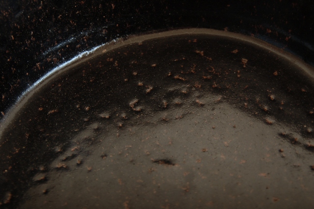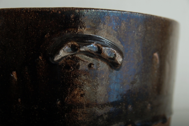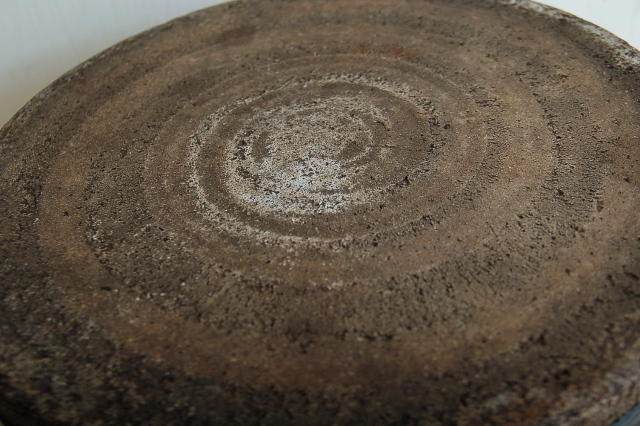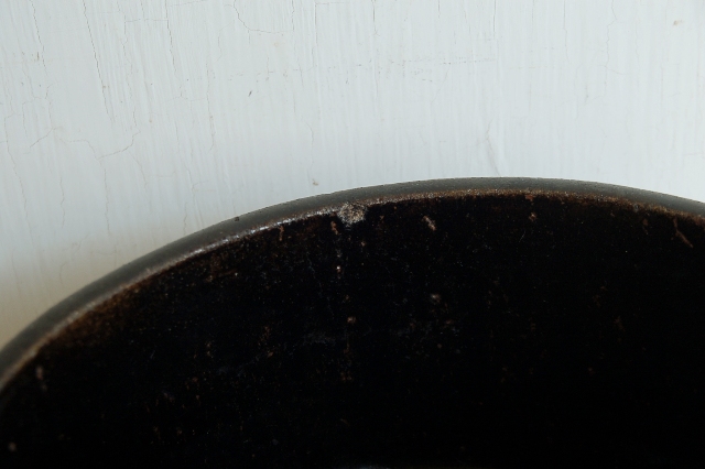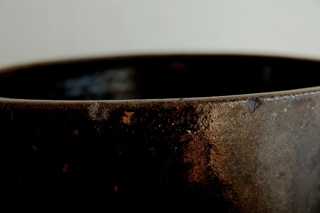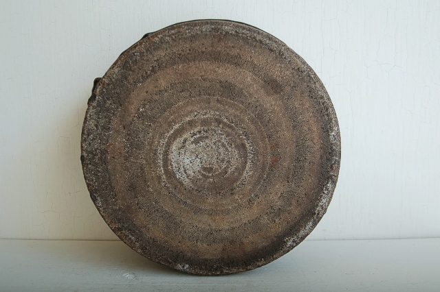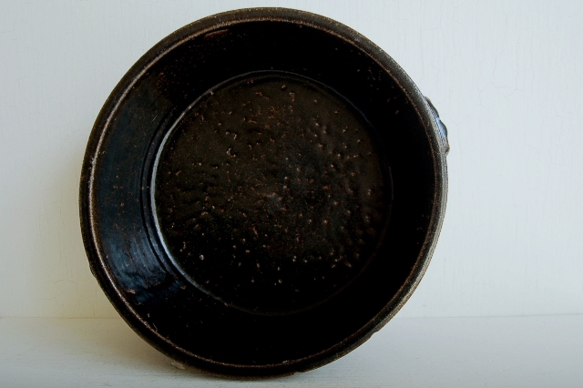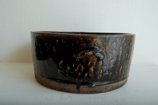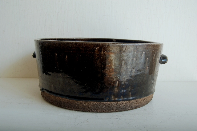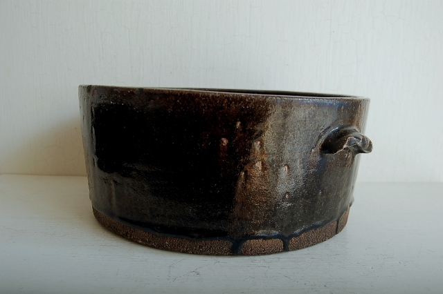 古本郷の珍しい鰊鉢。長方形型は何度かここでも紹介しておりますが、丸型で桶のような形は初見です。鰊を漬ける以外に用途があって作らせたものかもしれませんが実際に使用されていた鰊鉢同様に塩分が染み込んでいます。桶の写しのようにも感じますが細部のつくりは古手の鰊鉢と同様です。大きな欠点はなく状態はかなり良好と言えます。類似は資料などを含めて観たことがないので本郷焼の資料としても貴重なものです。質実剛健でありながらも丁寧に作られ、底面も手を抜いておりません。釉薬の表情も野趣あふれる本郷らしいもので、今まで僕が扱った本郷の中でも最高のものと自信を持って言えるもので、東北の暮らしの中で生きた本郷焼を代表するものと言っても言い過ぎではないと思っております。