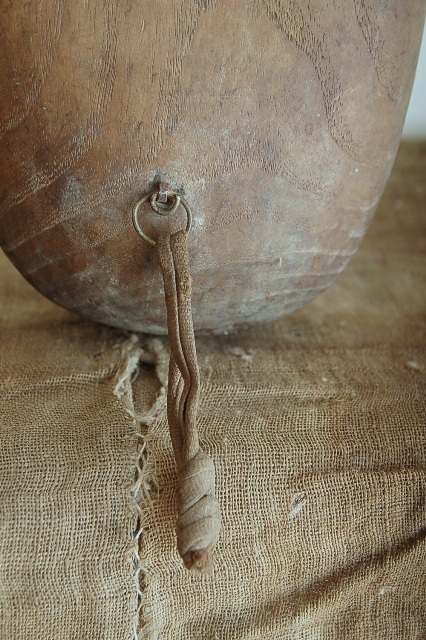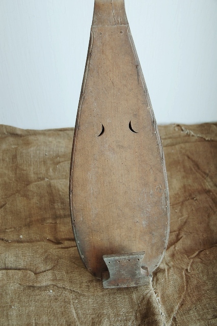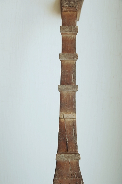 盲僧琵琶の「笹琵琶」。土着的な宗教音楽のひとつで古くから九州各地を中心に中国地方、山陽地方、若狭に至るまで盲目の僧侶が仏教儀式(檀家を廻って荒神祓いなどの法要)で琵琶の演奏と共に経文を読んでいました。明治に入り、廃仏毀釈によって、その行為はもちろん、盲僧としての地位も禁じられ衰退しました。雅楽の琵琶とは異なり、様々な形があり、そのつくりは素朴なものが多かったようです。こちらも非常に素朴で簡素、携帯しやすい為に細身に造られてていることから「笹琵琶」と呼ばれています。経年による痛みはございますし、部品の紛失や、修理の跡、反りなどはございますが一木で造られたその簡素で素朴、庶民的な風貌は一般的に雅楽の煌びやかな印象を感じる琵琶とは対極なイメージで、独特の空気感を放っています。控えめながらもオブジェとして力強い存在感があり、途絶えてしまった土着的な信仰を思い浮かばせてくれるものです。