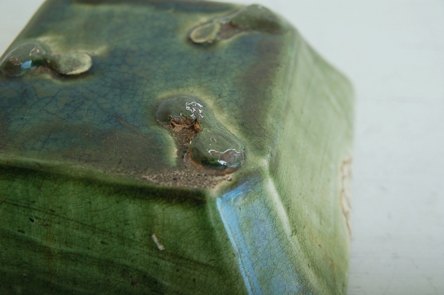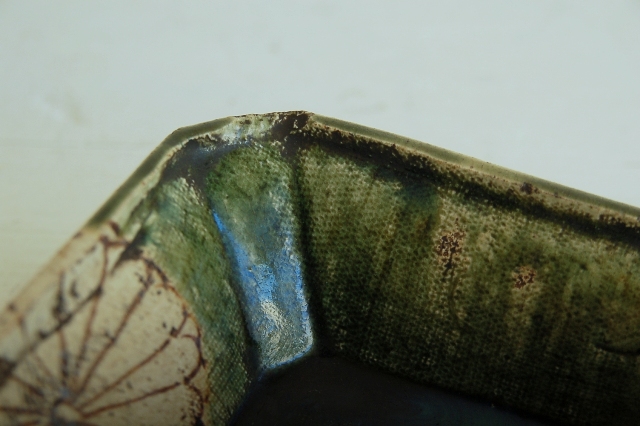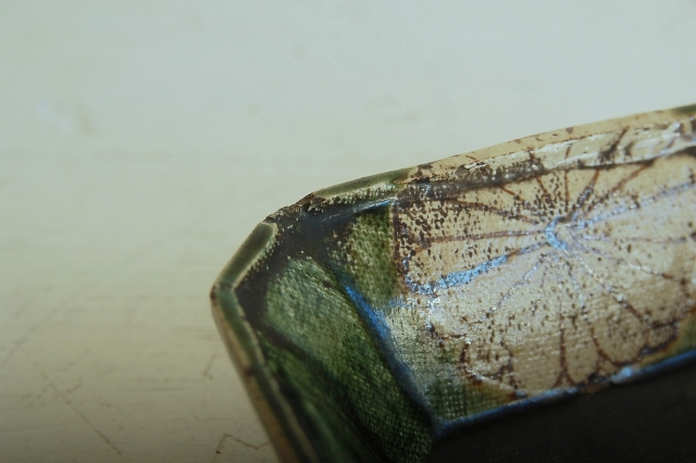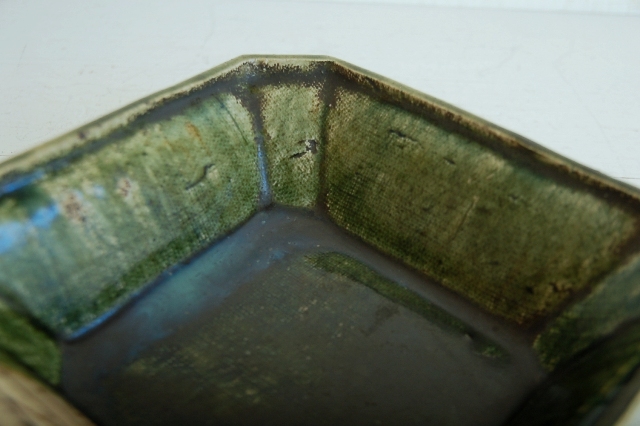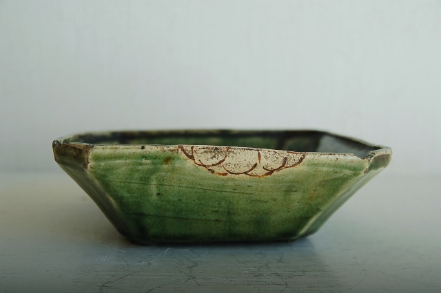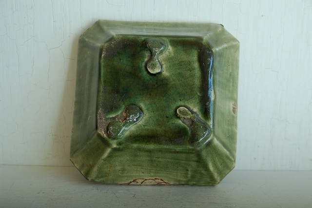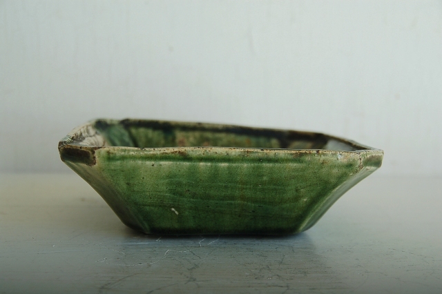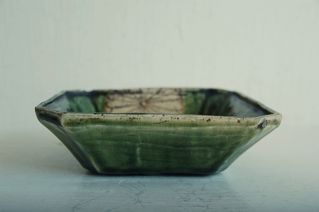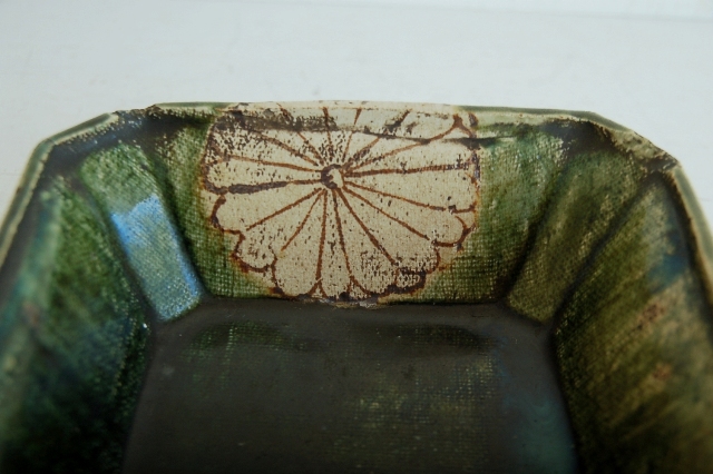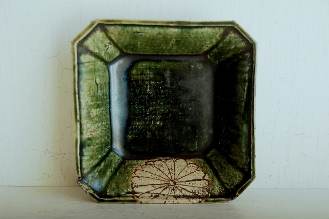 鮮やかな緑釉が魅力の織部菓子鉢。菊花文が1つ描かれておりそれ以外は緑釉がたっぷりと掛けられています。内側に溜まった釉薬の濃い色が渋みを増しています。縁周りにソゲがありますが釉薬がのっています。また裏の瓢形の脚は上手に共直しされております。食卓でも非常に使いやすいサイズで四角の形は収納し易いです。