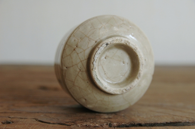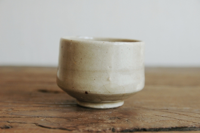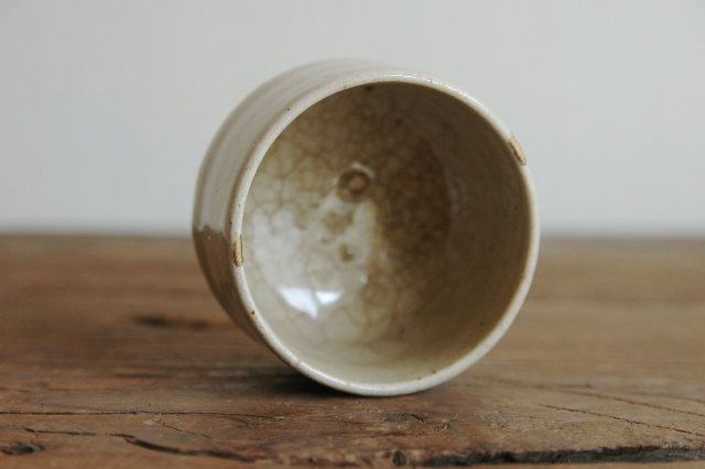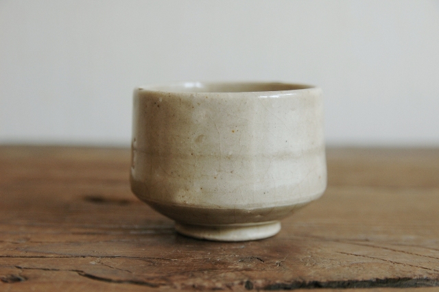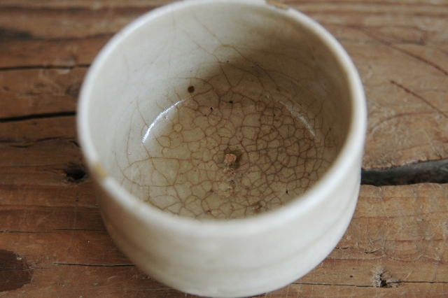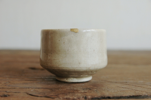 美濃の輪線半筒茶碗。盃としてもいけますし、日々の湯呑としてもいけるサイズ。輪線といっても胴回りにうっすらとある程度でほぼ無地とお考えいただいた方が良いです。見込みはそれなりに慣れがあり盃として日々使われていたことが伺えます。縁周りに直しが2か所ございますが、雑器として生まれ使われてきたものですのでこの程度は充分許容範囲内と判断しております。