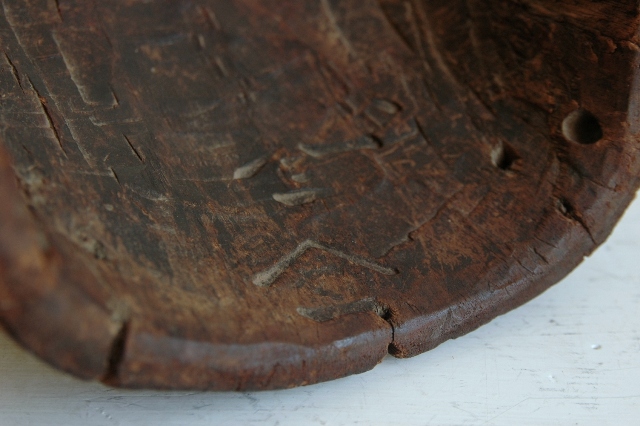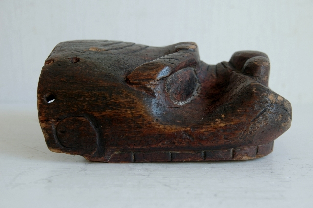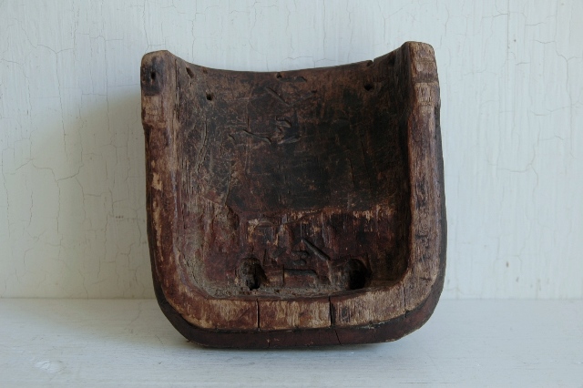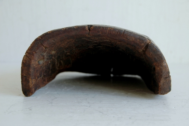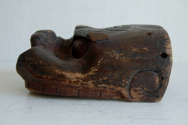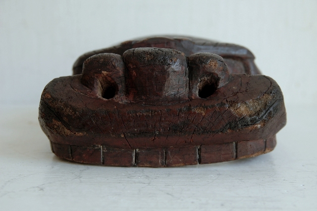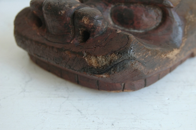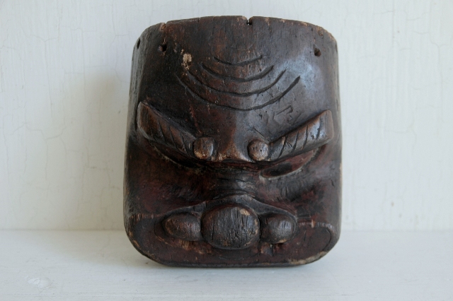 ペタンとした平べったい感じで愛嬌のある顔つきです。東北地方山形県近郊で良く見られる形です。裏側には屋号の焼き印も押されているので商売や繁栄を祈願して作られ毎年のように使われていたものと思います。彩色ははがれトロトロの艶のある表情はこの手の品物ならではの魅力。松材なのでこのような表面に変化していったのでしょう。時代を経て乾燥してので見た目よりも軽いです。それなりに時代があるものと思います。