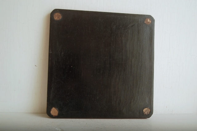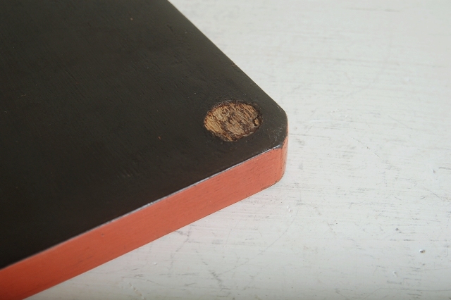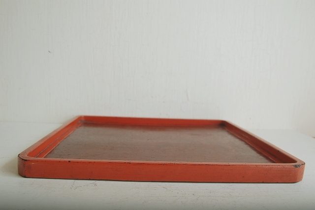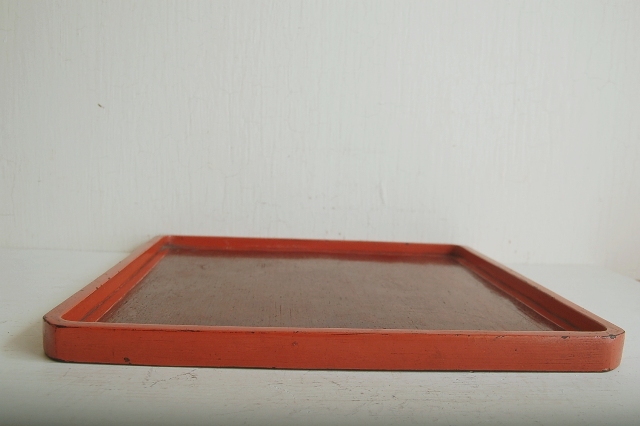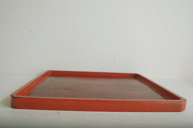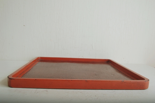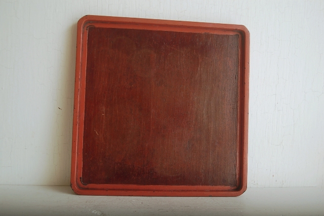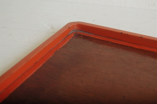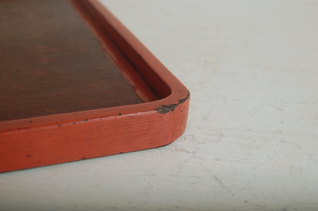 立上りの低い隅切盆。縁周りは朱に塗られ、擦れた角からは黒の下地が少し見え隠れしています。脚が付いていたようですが、取れています。丸っぽい形状からおそらく胡桃の脚があったのでしょう。反りはなく状態はまずまず。光があたり、斜めから見るとへぎ板の感じもわかり面白い表情です。晩酌はもちろん、敷板などにも使えます。