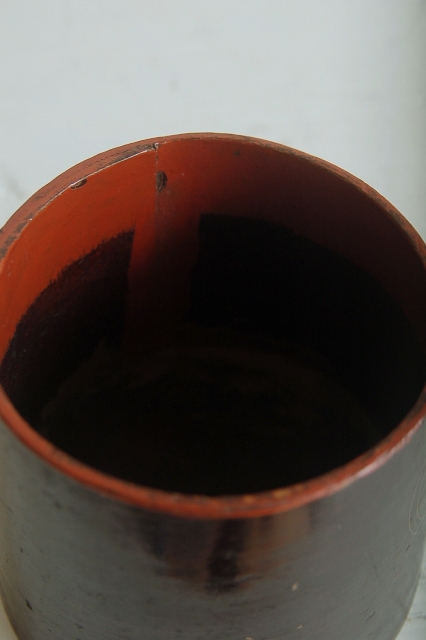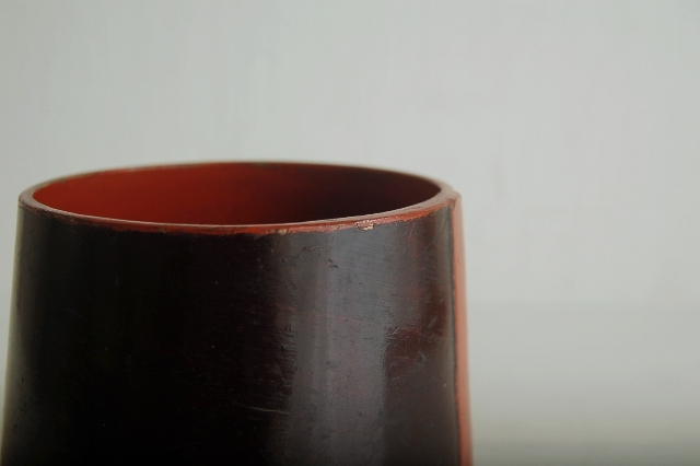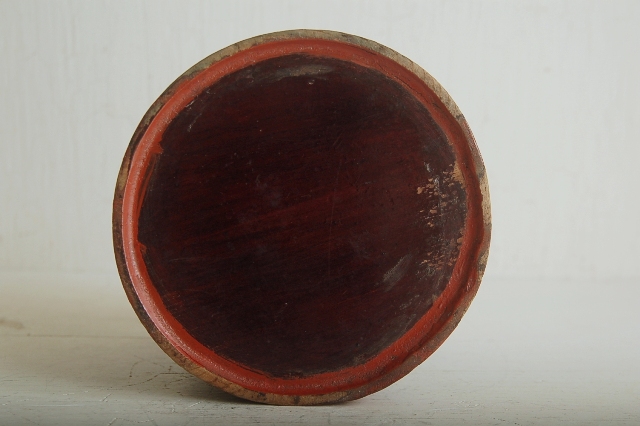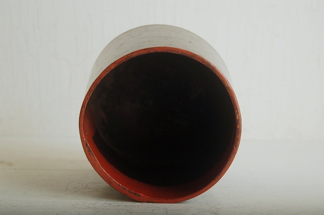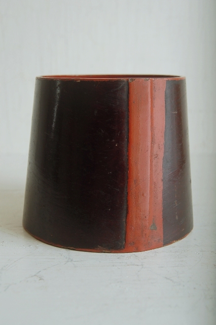 ワッパのような製法で作られた筆筒。上部へ向かって先が細くなる凝ったつくりで家紋も丁寧に描かれております。縁周りやつなぎ目にある朱の塗は後になって補修したものかと思います。その補修もそれなりの時代がありますので違和感ありません。筆立としてはもちろん、そのまま飾るだけでも家紋と形、補修跡が何とも言えない魅力を醸し出しています。
