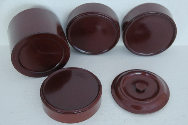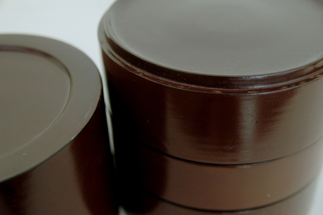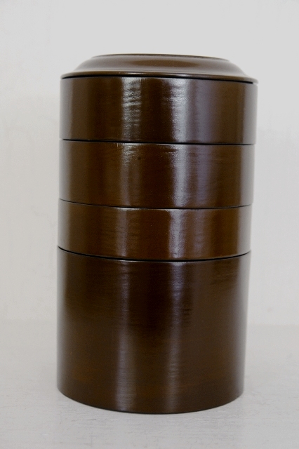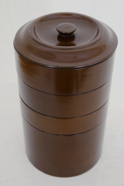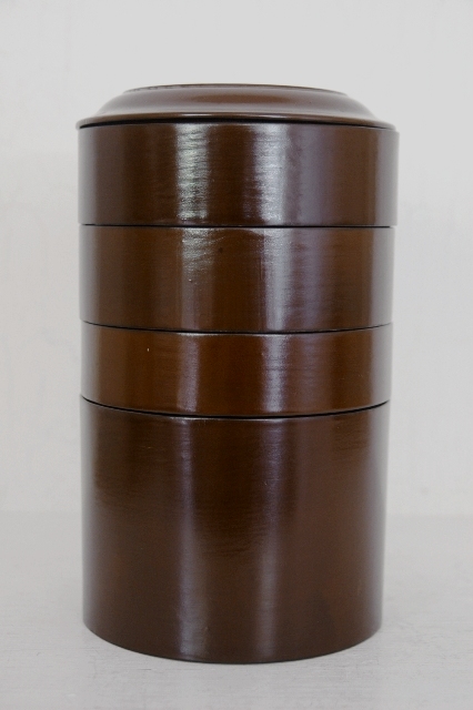 茶色の淡い色合いが上品な塗の弁当箱。ハゲなどなく弁当箱としても問題なくお使いいただける状態です。塗は上質で木地も薄つくりで上品さを感じます。形も細長くタワーのようでそのまま飾ってもモダンなオブジェのような感じです。