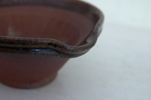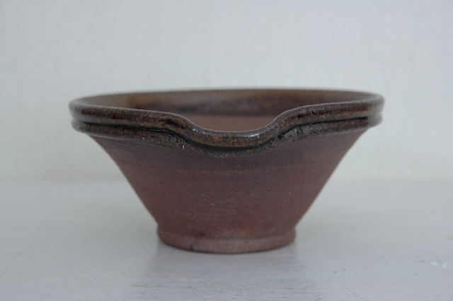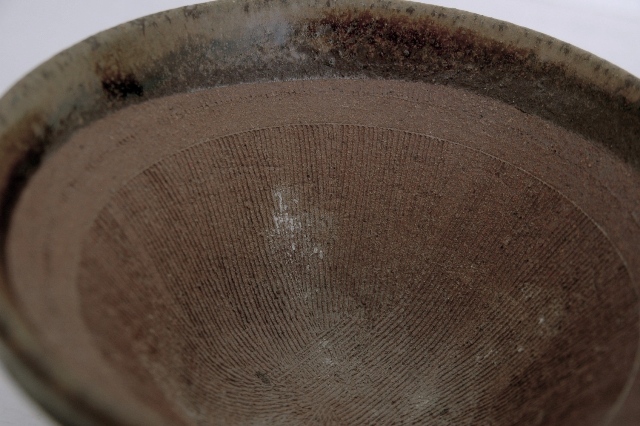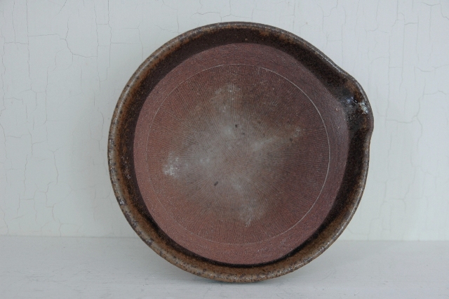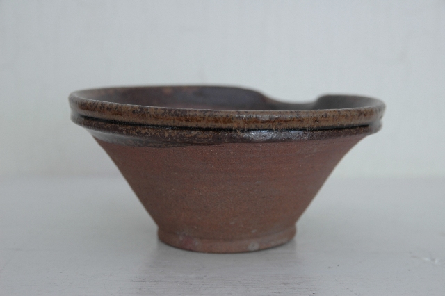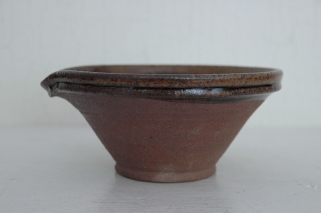 皆さんがお探しであろう小ぶりの擂鉢。大ぶりなものは比較的見つけやすいですが、このサイズでそれなりに古いものってなかなか見かけません。しかも状態はかなり良いです。ほとんど使われておりません。縁周りに釉薬が掛けられ、その下は焼き締めの渋い焼き上がりです。現代の食卓には非常に使い勝手の良いサイズは本当に嬉しいですね。本郷らしいワイルドな風貌も備えつつ、つくりは丁寧なものです。