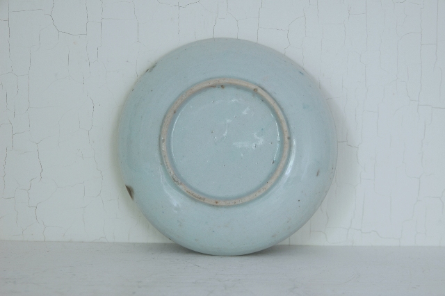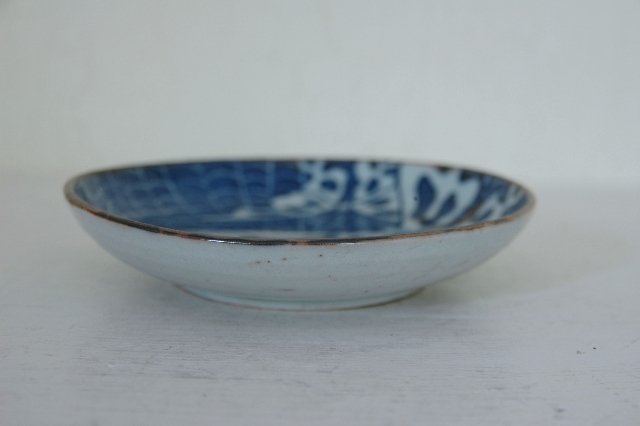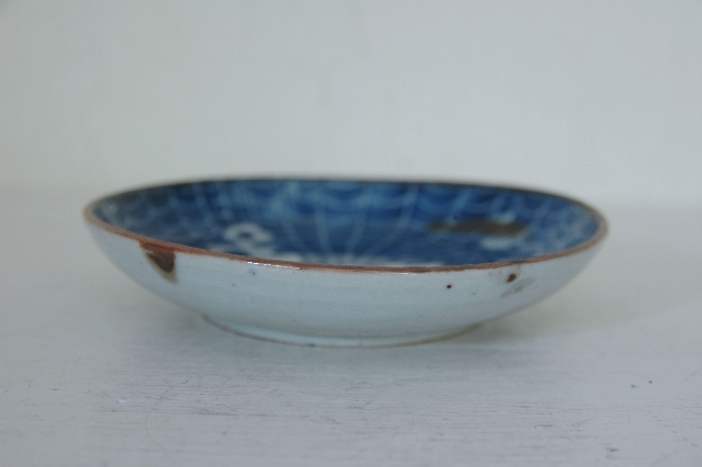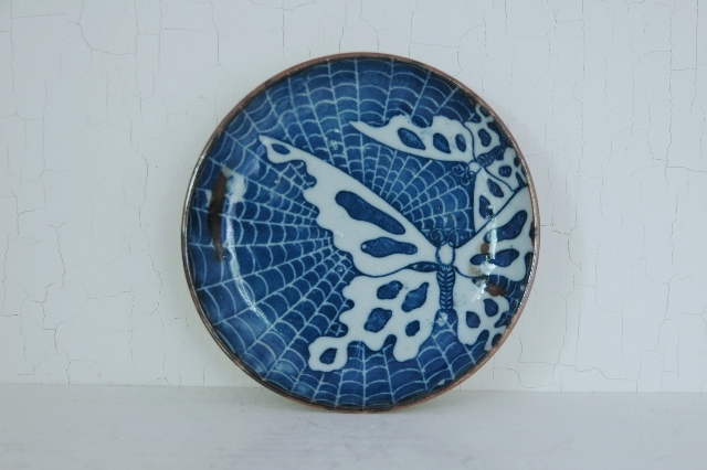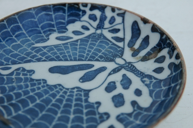 蝶々の模様がインパクト大の印判の皿。普段、染付けや印判のものってほとんどここでは紹介しておりませんが、この皿は見たときの印象が強かったです。大きな蝶にそのバックはくもの巣、くもの巣に囚われてしまった蝶を描いた図のようです。一見残酷な気もしますが自然の摂理ですし、僕ら人間だって狩猟して食べ物を捕獲しますから同じ事をしているわけです。この図柄は本当に珍しいです。疵、カケ、ニュウはございませんが古いものですので充分ご理解のうえ御注文下さい。