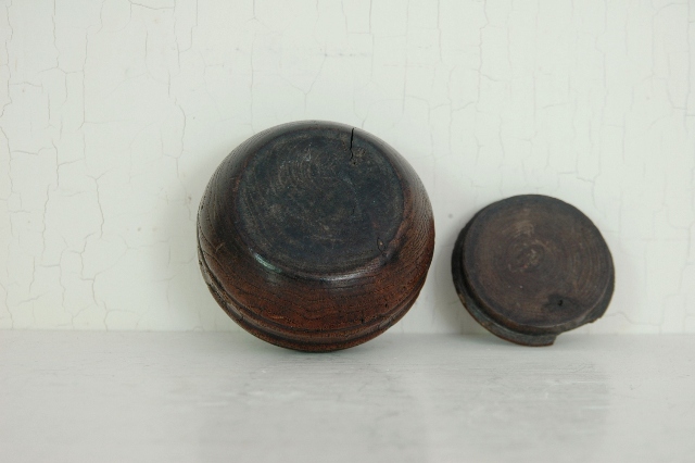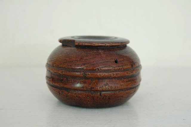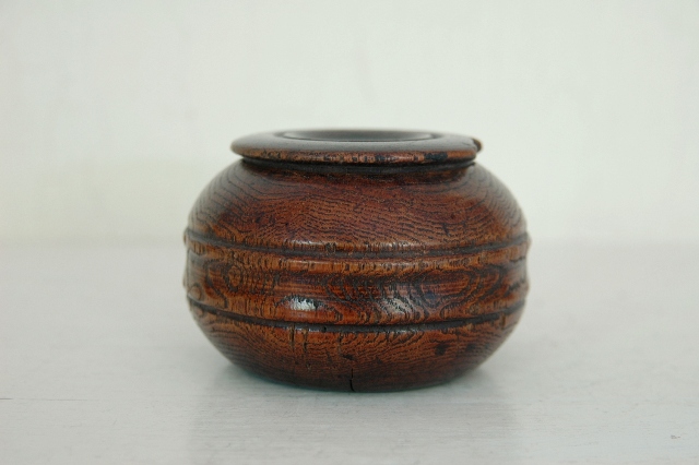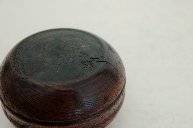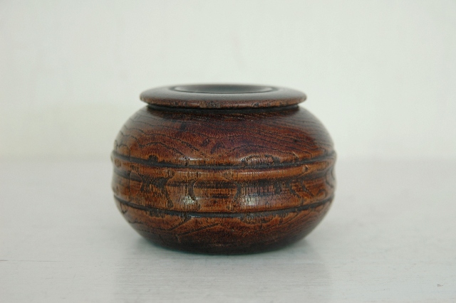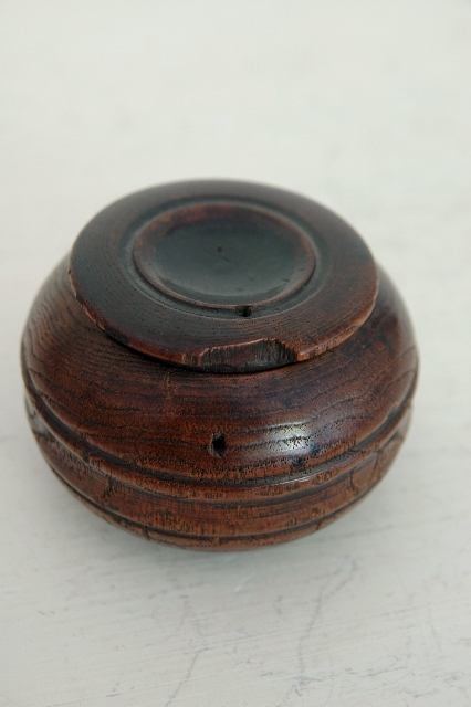 桑の木でつくられて刻み入(?)。薬壷とも思える形状はしています。桑でありながらも非常に軽いのは長い時をかけて少しずつ乾燥した為でしょう。木の風合いはだいぶ古いように感じますが詳しい時代は判別できません、江戸の終わりくらいのものでしょうか。塗は施されていなく、素地が使い込まれ艶やかになっています。蓋も今尚きっちりと閉まりますが本体にひびがありますので、実際に何かをいれ密封に近い状態で保存することはできません。胴には2本の筋が入っており全体をきりりとさせています。