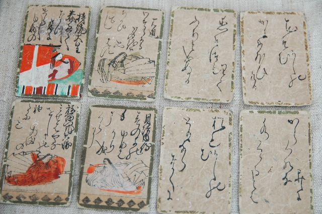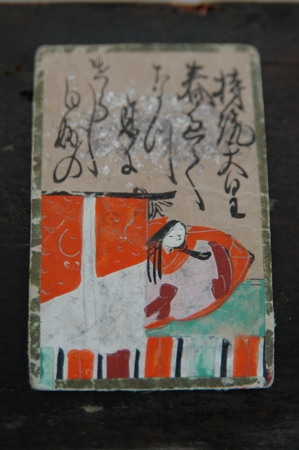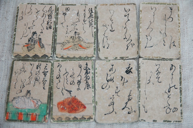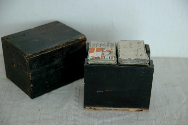 江戸中期の百人一首。歌は肉筆で、絵は木版擦りで彩色が施されていますが、持続天皇のみ絵は描かれています。また銀泊も散らされています。箱は虫食いだらけでいまにも壊れてしまいそうなくらい痛んでいます。オリジナルの箱ですのでそのままお付けいたしますが、発送の際には粉が落ちたり、破損する可能性もございますのでご了承下さい。画像でも確認できますようにかなり使い込まれています。読み札95枚、取り札96枚で全部はそろっておりませんが当時の華やかな遊びを感じることができる品です。古いものですので充分ご理解の上ご注文ください。