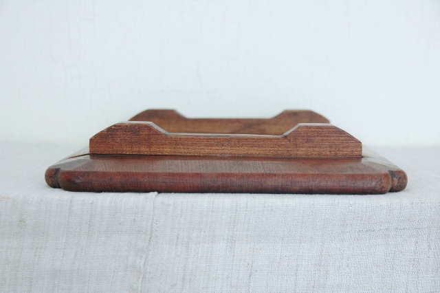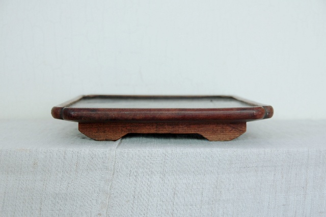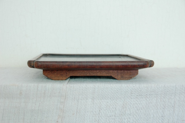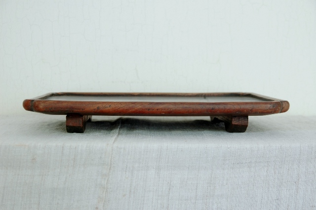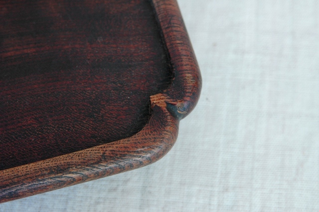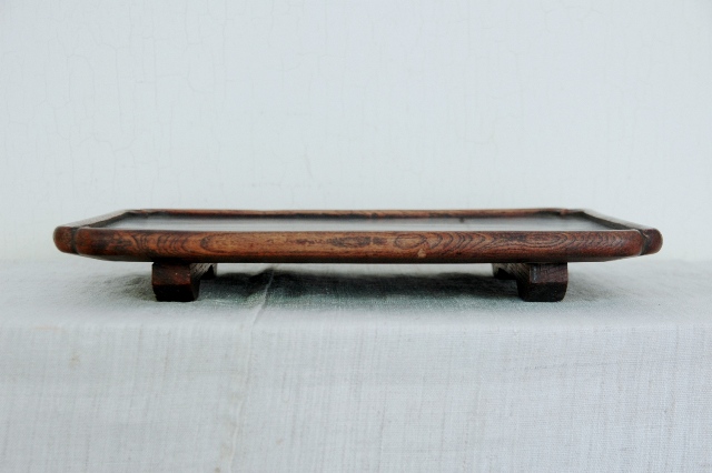 おおぶりで晩酌でもお使いいただける使い勝手の良いサイズです。もちろん、花台、コレクションなどを飾る台としてもお奨めです。拭き漆で木地が生かされた仕上なので使い込まれた風合いが魅力的。一カ所角にひびがありますが木材の乾燥の為でしょう。これ以上にはなりにくいと思います。平な場所で少々ガタツキますが許容範囲内と判断しています。この手のものでしたら良い状態です。新たな艶だしなどは行っていないオリジナルの状態です。