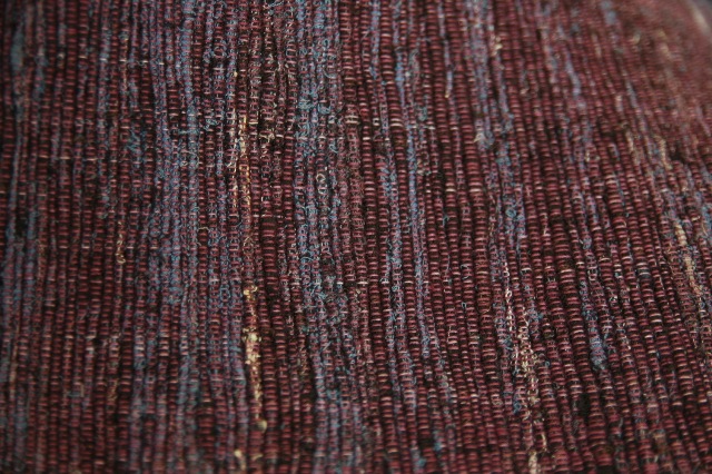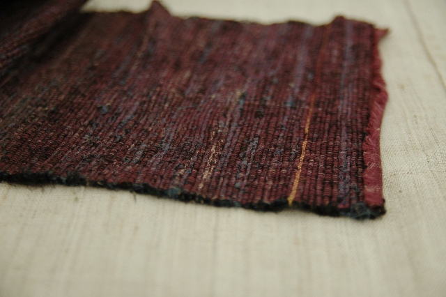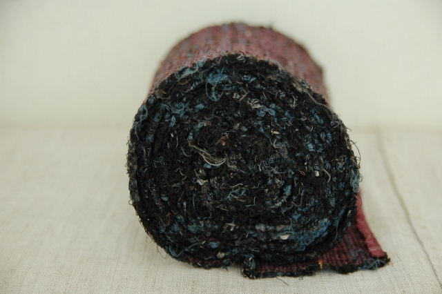 状態の良い裂織の帯。裂織とは不要になった布を裂いて新たに織った布のこと。色々の布を裂いてつくっているので独特の色あいになっております。普通に見たら紫が主ですが、側面から見ると藍の木綿の色合いです。材料として再び再利用するもよし、敷き布としても味わいがあります。東北に行った際に仕入れたものです。裂織は日本各地でございますが、東北地方は比較的面白いものが多いのは、都からの距離が遠かったこともあり、高価な布を大事に最後まで使ったからでしょう。材料の布は古いものですが、状態の良さから大正〜昭和頃に製作されたものかと思います。