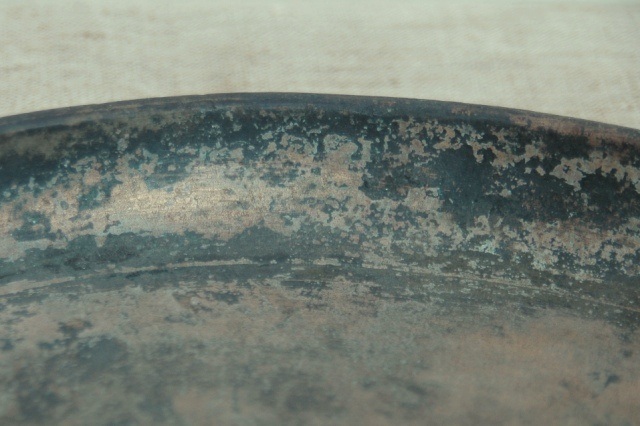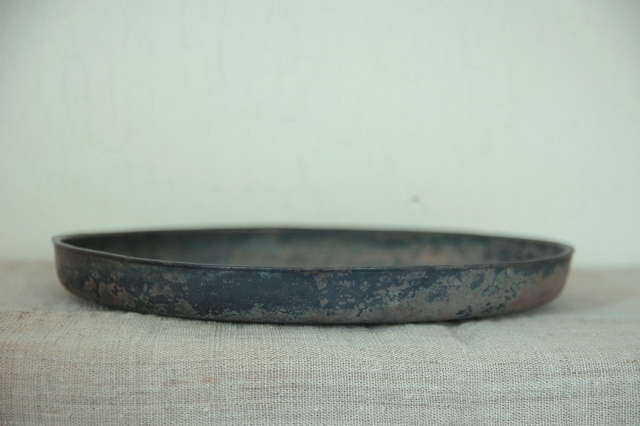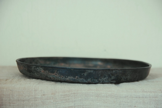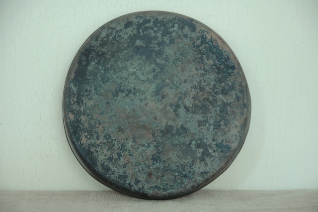 使い込まれた燈明盤。ずっしりと重い銅製で寺院などで使われていたものと聞いております。緑青のコントラストが非常に味わい深いです。凹みや傷などもございますが独特の表情は色々と使い勝手があるかと思います。その風合いから少なくとも江戸の前期かそれ以前はあるものの判断しております。磨きや手入れなどはしておりませんので充分ご理解の上ご注文ください。