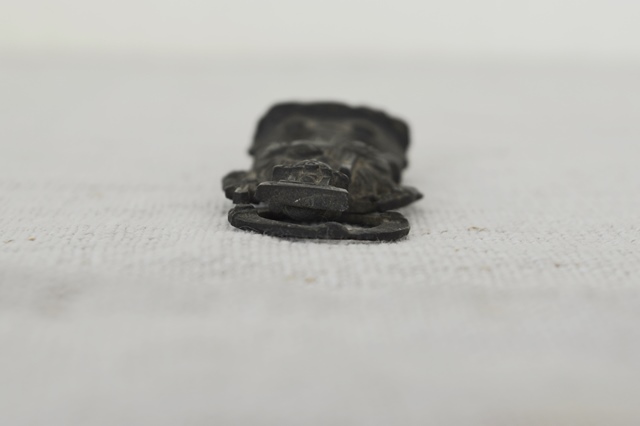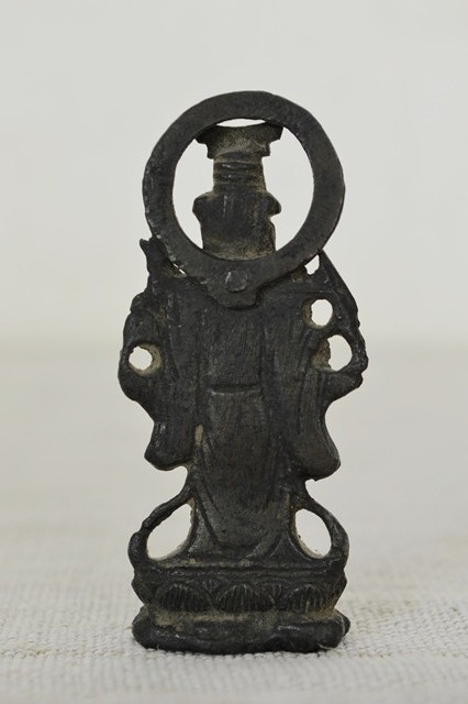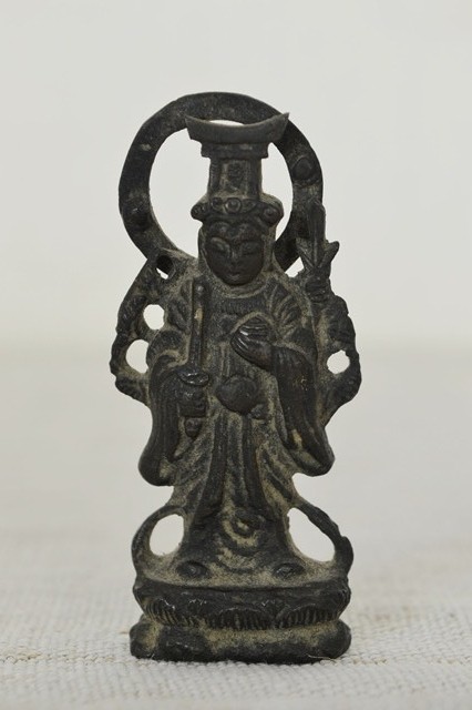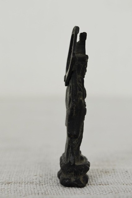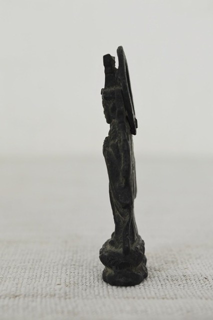 古銅で製造された弁天財。懐中仏、旅仏と呼ばれるものでしょう。残念ながら厨子は紛失しておりますが掌に納まる愛くるしい弁財天は魅力的です。材は銅(赤)強く黄銅(真鍮色)ではないので材質からも時代はあります。頭に鳥居があり、竹生島宝厳寺の大弁財天を思い出すような小ぶりながらも存在感のある品です。