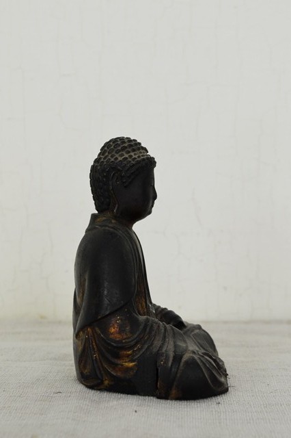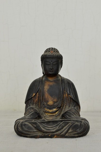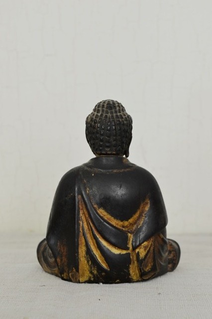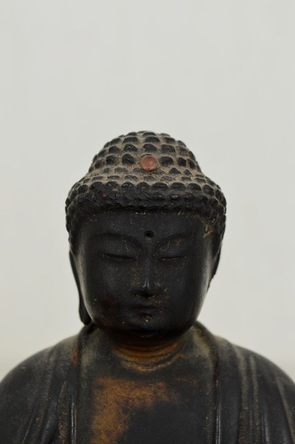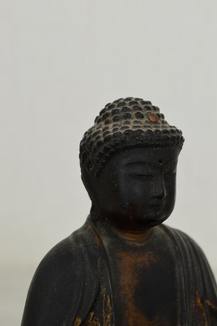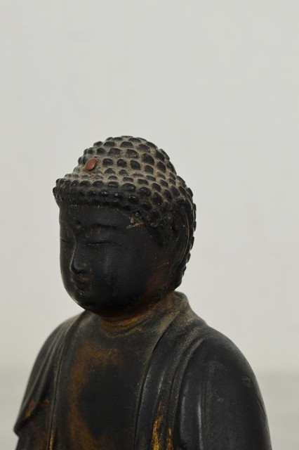 小ぶりながらも彫が良く存在感抜群の阿弥陀如来像。上質で堅牢な漆で施された表面は時代が経っているにも関わらず美しく、衣の動きを表情豊かなに表現しています。白毫は無く、玉眼ではございませんが、赤い肉髻珠は残っております。両手はございません、また、残念ながら厨子、台座は紛失しておりますがそれらの欠点を考慮しても充分魅力的な仏像です。江戸期のものと判断しておりますが、襟元や衣の彫は中世を感じさせます。
