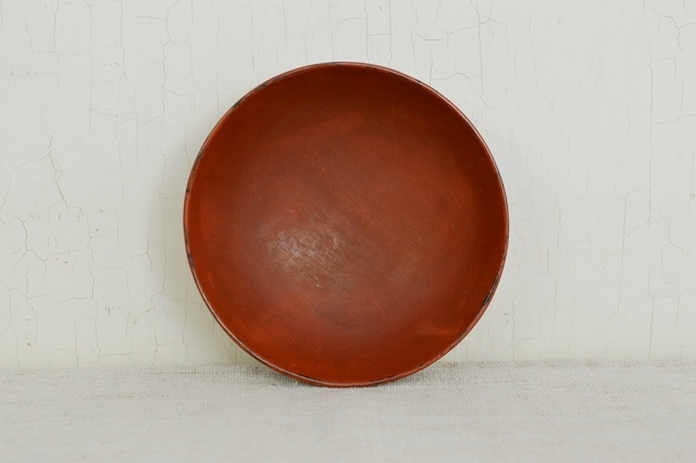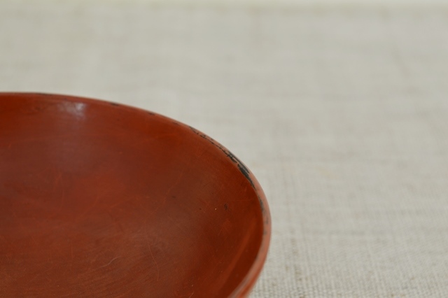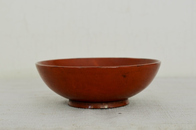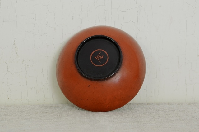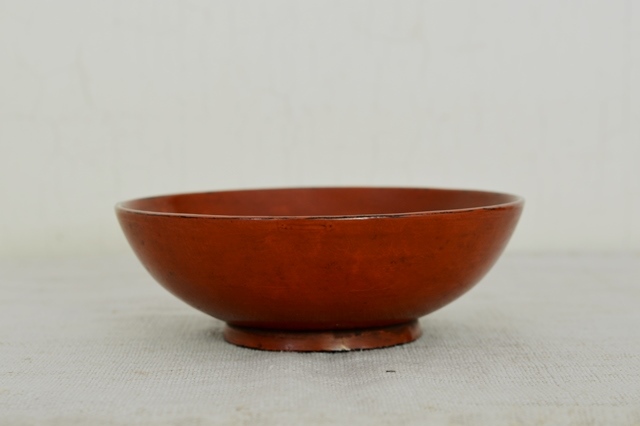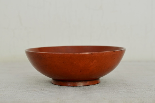 三つ碗などのひとつかと思われますが、味のある碗です。たくさん飲む方なら盃としてイケるかもしれません・・。ちょっとしたおつまみをのせたり、お料理に使ったりと状態がよいので食器としても充分お使いいただけます。仕上がりをみると漆の感じから東北のもののような気がしますが布をきせておりますので輪島周辺のものかもしれません。いずれにせよ堅牢な塗で縁廻りは少し擦れて中塗りの黒い朱の色が見えており、落ち着いた朱の色がさらに見え隠れする黒をひき立てています。気兼ねなく普段の生活で使ってほしい品です。時代相応の経年による変化がございますので充分ご理解、ご確認の上ご注文ください。
