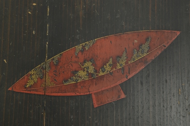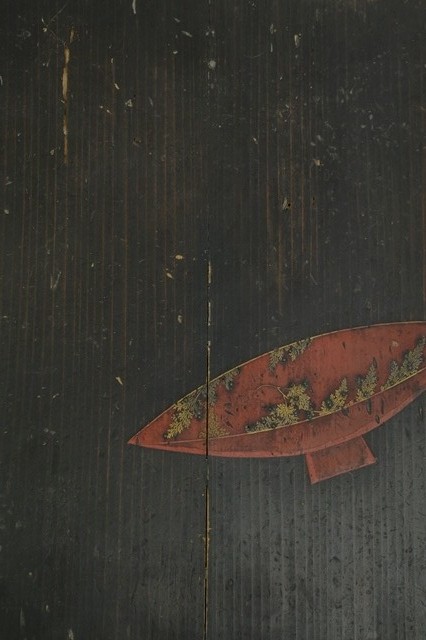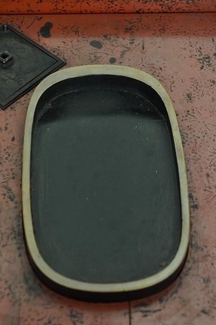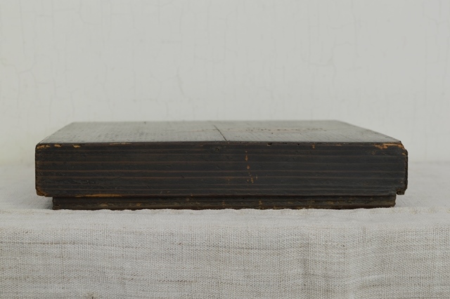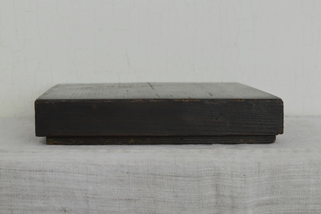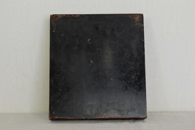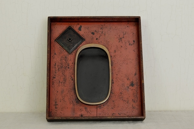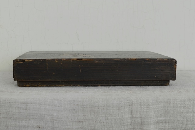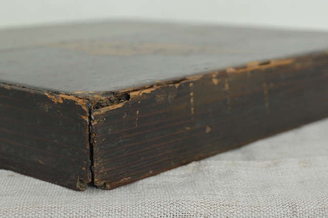 侘びた表情が素晴らしい硯箱。質素で素朴な作りと思いきや、細かな部分、随所にこだわりを感じる品です。まず、木の表情、木目の素地を生かした表側に盃の蒔絵は素晴らしい出来栄えで細かな部分も一切妥協していない仕事ぶりです。中は、研ぎ出しで、黒の中塗りの前に模様を描きその後上塗りを施し研ぎ出し模様を出すという渋い仕事です。かなりの美意識を持っている識者でなければこのようなものは作らないでしょう。蒔絵の雅なものの対岸にあるものですが美しさは全く負けておりません。高蒔絵のものは数あれどこのような類例は初見です。箱などは無なく、書付もありませんが以前の持ち主の情報で清水比庵(歌人、書家、画家、政治家)所蔵のものだったとのこと(証明することはできません)。この硯箱のただならぬ雰囲気ならば納得できます。古いものですので、経年による変化、擦れ、細かな傷、虫食い個所などございますので充分ご確認ください。桃山〜江戸期。