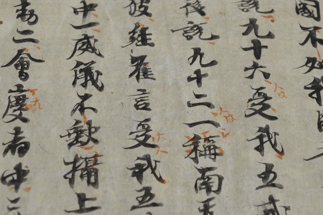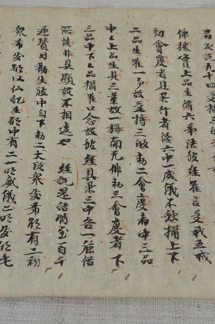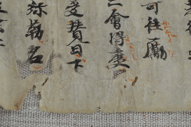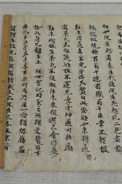 詳しいことは調べてはおりませんが、雰囲気のある写経。鎌倉期のものと判断しております。一文字、一文字しっかりと書いた字は何か感じるものがあります。時代の古い写経の文字はやはり良いです。赤い文字もあります。小さな虫食いもございますが充分鑑賞に耐えうる状態かと思います。箱は味の良い木箱ですが、養生箱とお考えください。また、端を押さえている物差しは撮影用の文鎮替わりですので付いておりません。