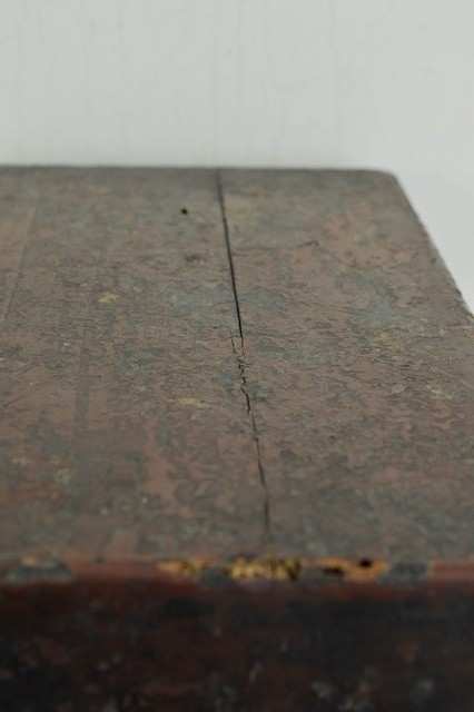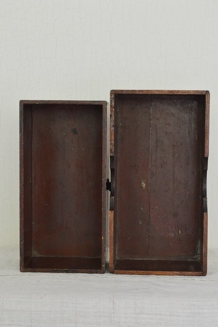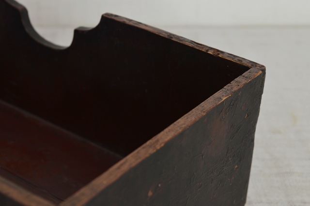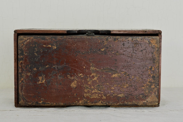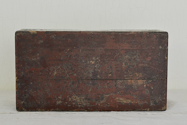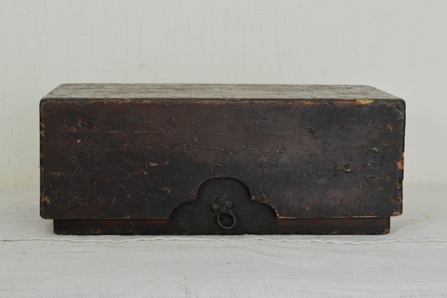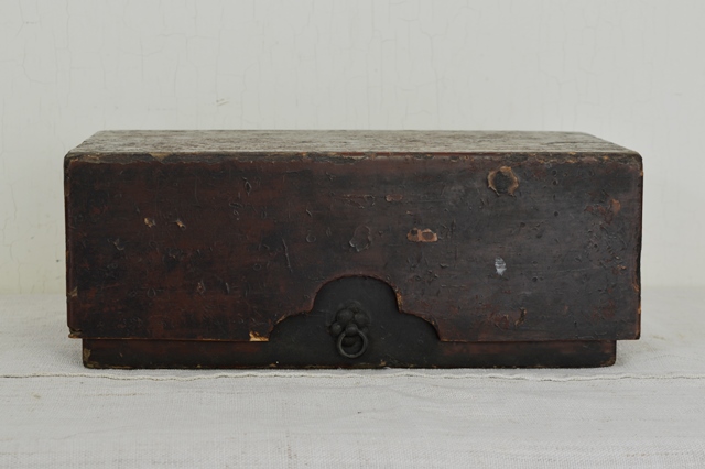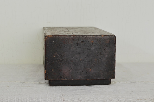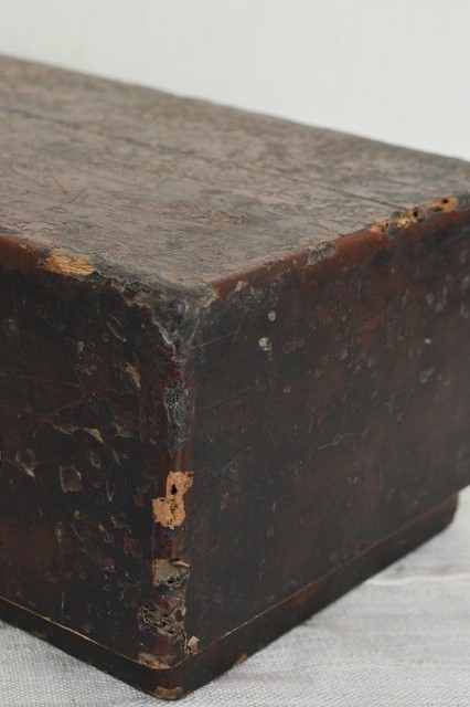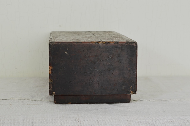 質素で素朴ですが時代がありそうな箱。漆の剥がれもありますがそれもまた味、時代を経た風合いは抜群です。上質な塗りのものではないですが、華美なものではないからこそ好感がもてます。状態は画像のままの決して良いものではございません。また蓋の縁を数ミリ切り落としているようです。おそらくボロボロだったのでしょう。好きな人にはたまらない雰囲気。