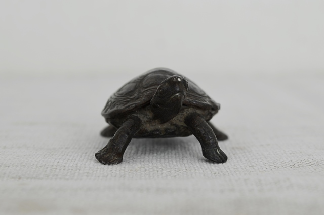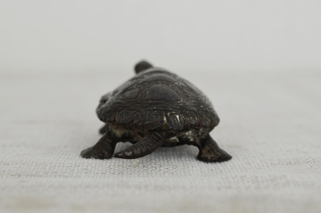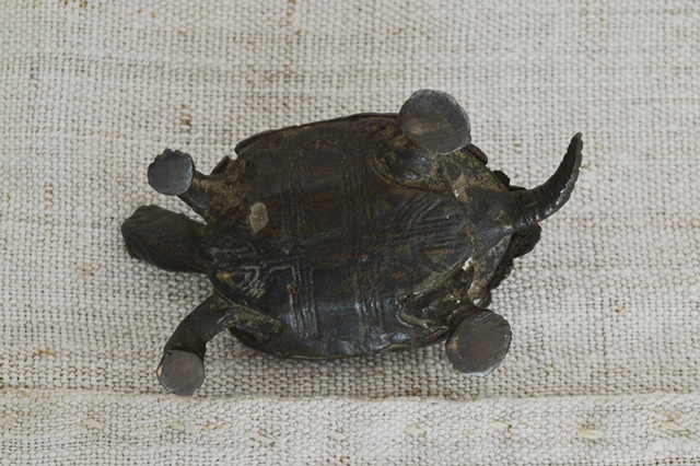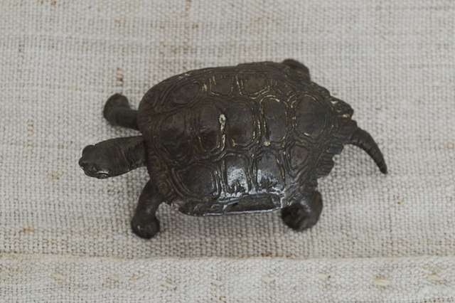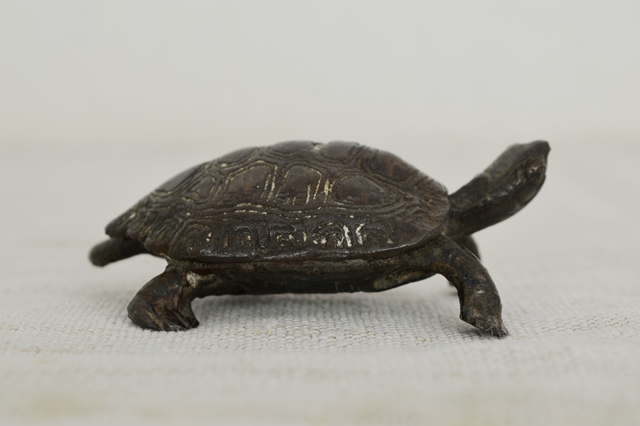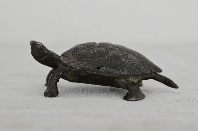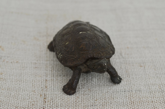 小ぶりながらも古格とかわいらしさが魅力の銅亀。景道やお庭などに良く使われていたもので識者でなければなかなか持っていないものでしょう。格段すばらしい出来のものではございませんが経年の変化が良い雰囲気を醸し出して柔らかな印象を与えてくれます。時代相応の経年の変化、キャストから抜いた時点で既にあったと思われる穴などがございますので充分ご確認、ご理解のうえご注文下さい。