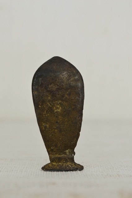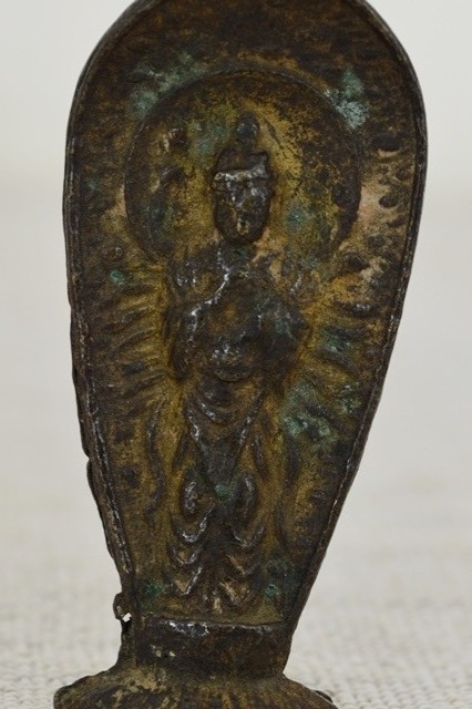 小ぶりで素朴ながらも存在感のある千手観音。決して丁寧な仕事、良いキャストの抜けが良い物とは言えませんが、緑青の経年変化の雰囲気やその佇まいは魅力的です。こちらも本来は懐中仏で厨子やお守りのように布の袋などに入れられていたものと思いますが現在は本体のみです。真鍮色が強く時代は古くても江戸期のものですが古格はそれ以上に感じてしまいます。そのまま飾るもよし。、礼拝用としても小さいので場所を取りません。