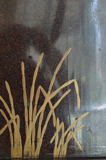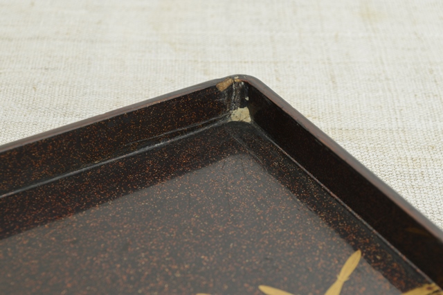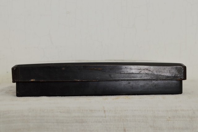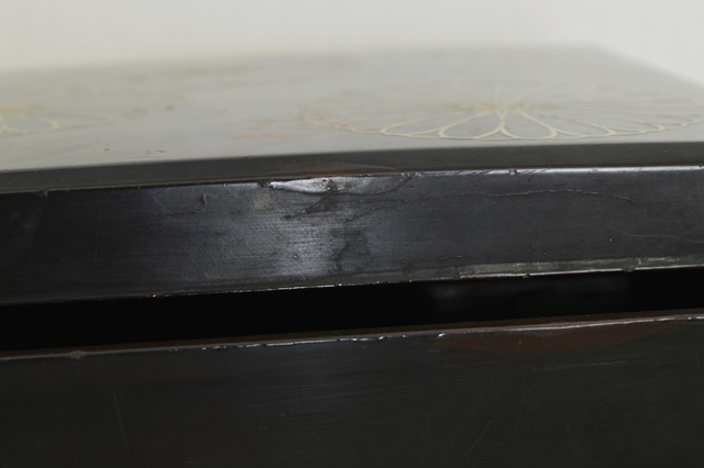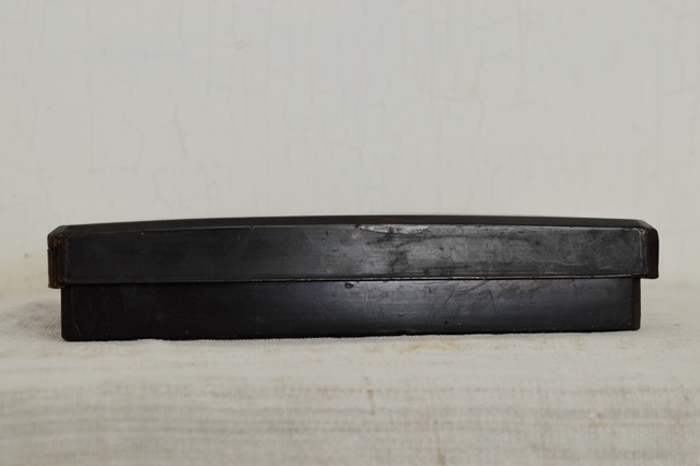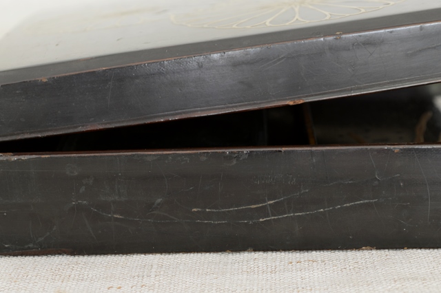 二十八重菊花文の蒔絵が三つ施された品の良い硯箱。中は梨地で木賊が描かれております。表より中が少し華やかなところが日本人らしさを感じます。過度の装飾がされていない蒔絵で、これを作らせた方、使っていた方が、この菊花文同様に精神性の高い人だったことを感じることができます。サイズはやや小ぶりで割れ、ひび、角に擦れ、修理痕などがございます。一般的な高蒔絵のものの評価でしたら良い状態とは言えませんが、時代、デザイン性、紋章の良さを考慮すれば痛みもこの硯箱のもつ雰囲気を醸し出していると思います。