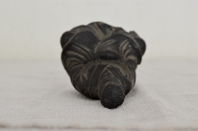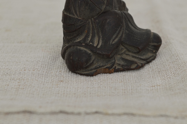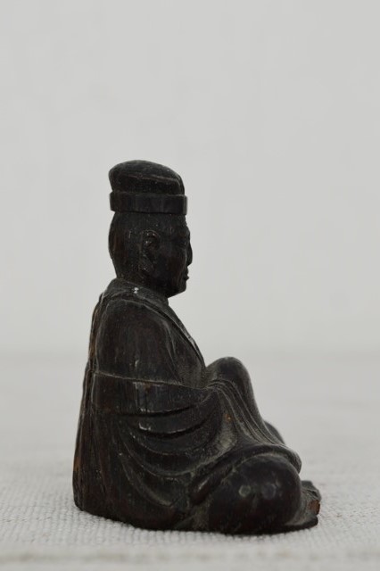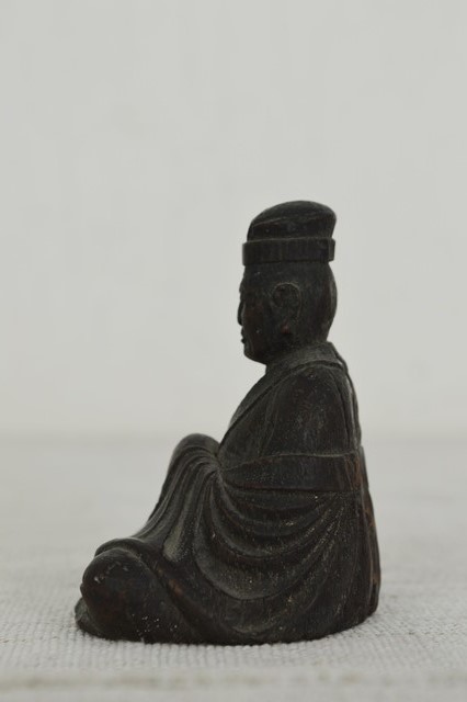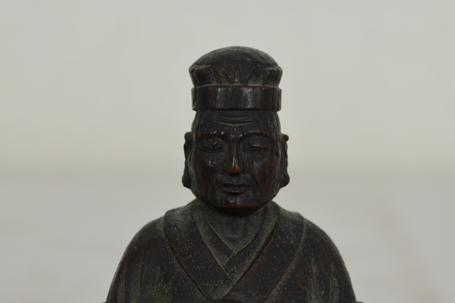 利休像かと迷いましたが柿本人麻呂と一緒に出てきたものですので芭蕉像と判断しております。材は欅で彫りも丁寧でありますので、仏師など木彫を生業としている人が創ったものと判断して間違いないでしょう。表情も穏やかで衣の彫りも実に上手に表現されております。時代による磨耗、カケ、埃などの汚れ、裏面には元々あったと思われる木目の後がございますので充分ご理解のうえご注文下さい。江戸期。