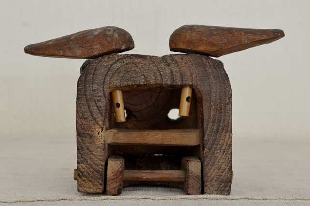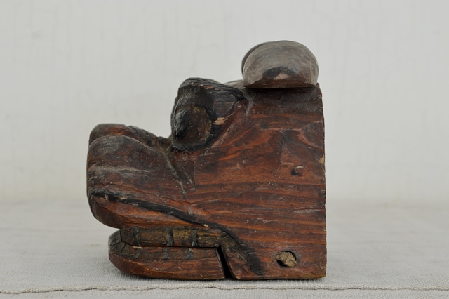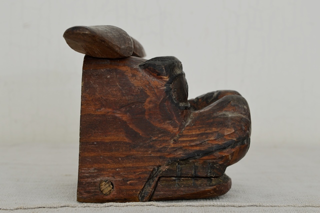 素朴すぎる東北の小ぶりの獅子頭。なんといっても小ぶりな希少なサイズは嬉しいです。プリミティブな造形はまっすぐな純粋な人々の気持ちが表れていると思います。色々なものが簡単に調べられ、動かずにして体験したかのような気持ちになれる現代に生きている僕らにはこのような造形は決して生み出すことのできないものかと思います。獅子舞はみんなが知っている行事ですが、西日本と東日本では形態が異なります。西日本では大陸からの影響が強いと思われる「二人立」、東日本では神事的な影響が強い固有脈の「一人立」こちらの獅子頭は間違いなく後者で人前で演舞する芸能というよりも信仰の意味合いが強かったものと考えられます。画像でもご確認できますように古いもので経年の変化がございますので充分ご理解のうえご注文下さい。