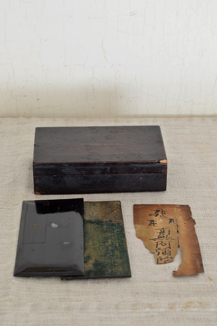 状態は良いとは言いがたいですが梵字と南無阿弥陀仏と書かれた紙片です。どういった為のものなのか詳細はわかりません。塗りの桐箱に黒塗の板二枚に挟まれています。本来はこの板の間にお経が折りたたんで入っていたと考えられます。この紙もその一部だったのかもしれません。小さなものですが心惹かれる魅力があります。江戸期。
