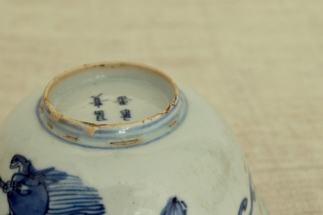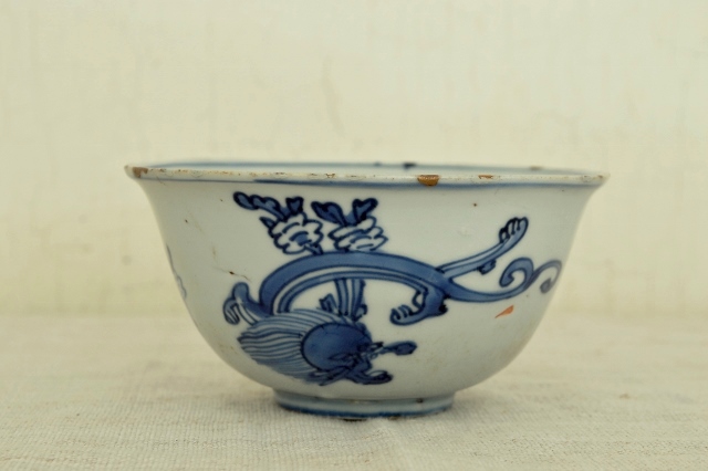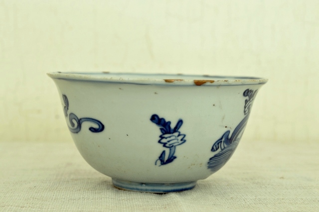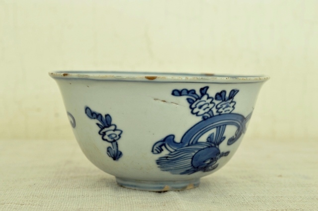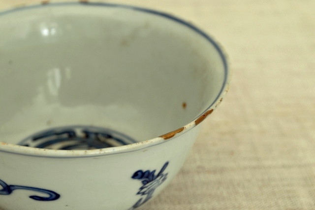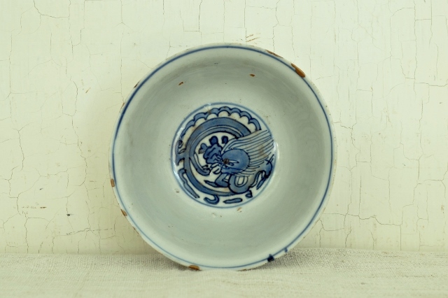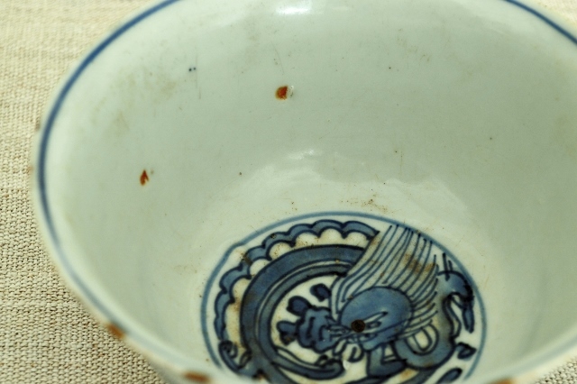 薄手の古染の茶碗。稚拙ですが味わいのある龍が描かれており古染らしい描き込みです。発色も良く、漫画チックな描写が実に面白いです。縁周りに金直しが施されておりますが、痛みではなく古染特有の虫食いを直したと推測されます。人によっては虫食いも口当たりが良くないと直した人もいるようですのでこの茶碗もそういった人が直させたものでしょう。直し(壊れていないのですが)は漆を使って実に丁寧な仕事です。大きな欠点はそれ以上ございませんが、画像をよくご覧になりご注文ください。明末清初。