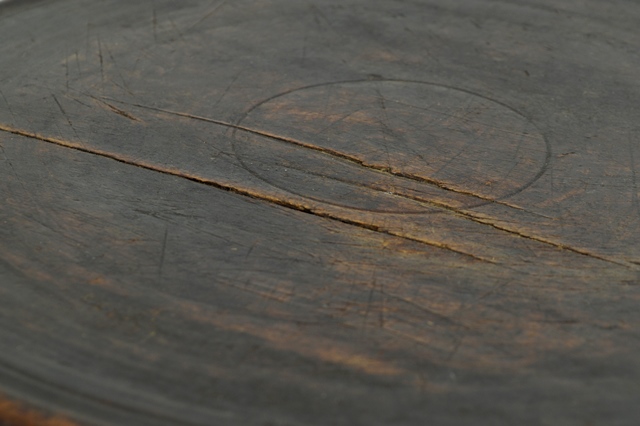 素朴な李朝の丸盆。低い立ち上がり、平らな面、低い脚に歪な轆轤仕上げに裏面の鑿のハツリ具合は言うことありません。時代もありそうです。盆の中でもかなり古めのものと考えても良いでしょう。多くの刳り貫き盆、日本や諸外国のものも数多く扱い、見てきましたが、これほど庶民派で、かっこつけていない感じのものは出会ったことがありません。海を隔てたお隣の国のものなのに、どこか親しみやすいのは僕の故郷福島の南会津からでる素朴な木地盆に作りが非常に近いこと(この盆は市場にはほとんど出てきませんが)。陶工と同じように木地師も渡来してきた方がはじまりなのでしょうか・・。南会津の木地師は江州渡木地師と言われており蒲生氏郷が桃山時代に会津塗の為連れてきたそうですが縄文的な思想、生活を営む彼らは大陸の技術を持っていたことになります。どこかで交流があり技術を身に付けたのか、それとも彼ら自身なのか?何百年も前なのに文化交流は今より庶民レベルでグローバルのような気がこの品を見ていると感じます。画像でもご確認でいますように充分ご使用に耐えうる状態ですが、日々、傷、カケ、角は丸くなり、色も経年により変化しておりますので充分ご理解いただける方のご注文お願い致します。