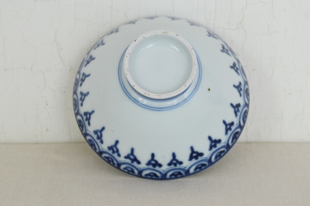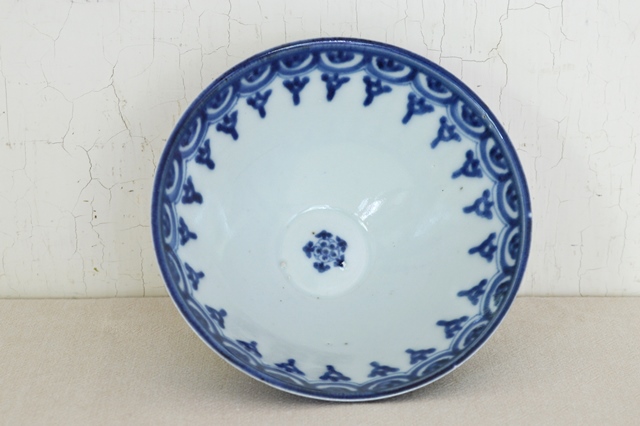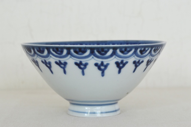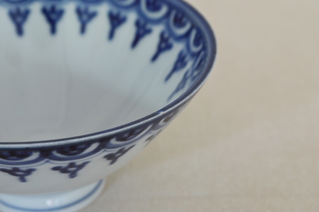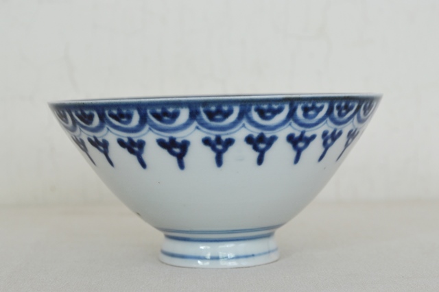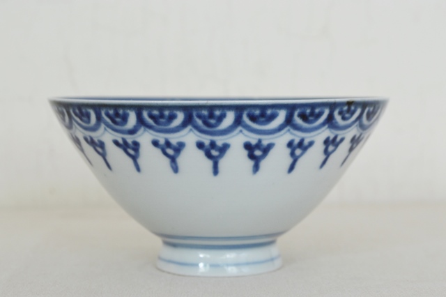 幾何学模様がモダンな伊万里の茶碗。飯茶碗にちょうど良いサイズで食卓でも重宝すること間違いなし。同じ柄の蕎麦猪口を見たことがありますが、茶碗は初めて見ました。茶碗でしたら蓋があったことも考えられますが、大きさ、形からかんがえると元々無かったのではないかと思います。気兼ねなく日々の食卓で使っていただきたい品です。縁廻りに極小の小ホツが2個ありますが、本当に小さなものですので気にせずに使える範囲かと思いますが、あくまでも個人的見解ですので充分ご確認、ご理解の上ご注文ください。江戸後期。