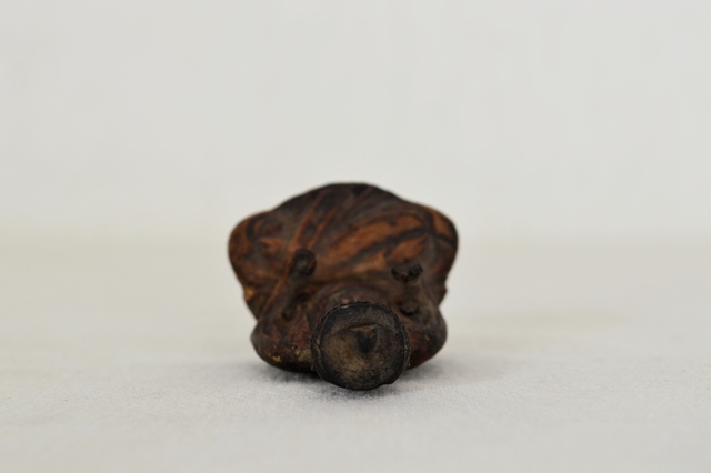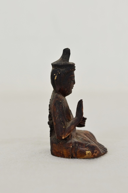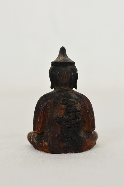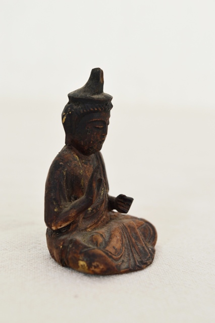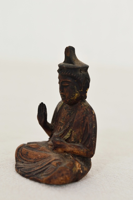 掌に乗ってしまう非常に小さな木彫の仏像ながらも良く彫られております。おそらく聖観音菩薩の座像だと判断しております。懐中用のもので本来は厨子に納まっていたものでしょう。小さいながらも存在感があり表情も優しく見ていて飽きません。持物(おそらく蓮)がなく、後ろに台座に取り付けた材が残っておりますがそれ以外に大きな欠点はございません。古いもので時代相応の経年による変化がございますので充分ご理解の上ご注文ください。