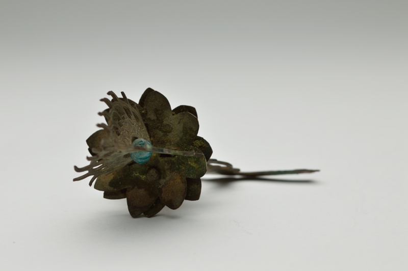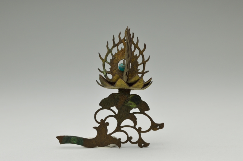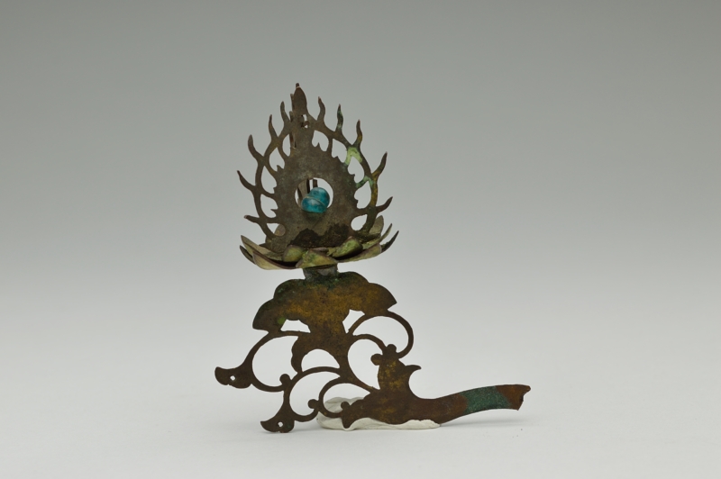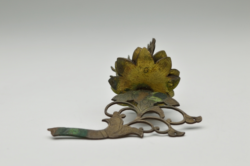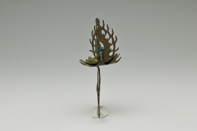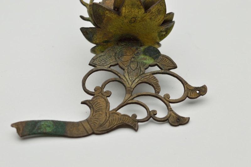 古くからの日本の金工技術の水準の高さを残欠ながらも感じることができます。やや厚めの銅板で、文様も鏨(たがね)で切ってあり丁寧な仕事です。青いガラス玉もひとつついております。仏像の装飾だったのか想像するしかございませんがこの小さい部品からも全体は素晴らしいものだったことは容易に想像できます。自立はせず、撮影の為美術用のネリケシを使用しております。あくまでも残欠ですので充分ご理解の上ご注文ください。ご不明ななどございましたらご連絡下さい。